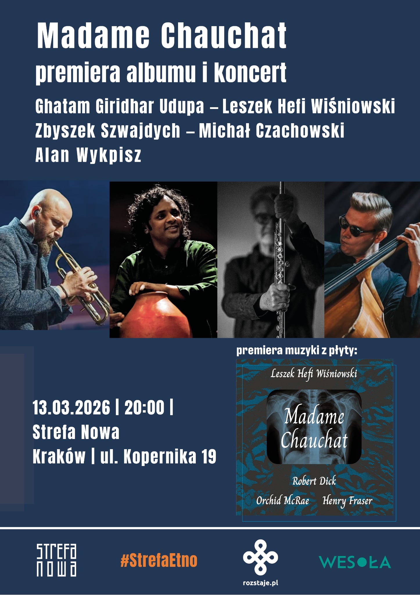 „Madame Chauchat” to autorski projekt Leszka Hefi Wiśniowskiego, stanowiący rozwinięcie jego wieloletniej współpracy z ikoną światowego fletu awangardowego, Robertem Dickiem. Po albumie „Power of Two” (Hefi Records, 2023) projekt został rozszerzony do formy kwartetu jazzowego, czerpiąc inspiracje z twórczości m.in. Ornette’a Colemana, Erica Dolphy’ego i Steve’a Lacy’ego. Album został nagrany w Nowym Jorku w 2025 roku z udziałem nowojorskiej sekcji rytmicznej: Orchid McRae (dr) oraz Henry Fraser (b). Literacką inspiracją albumu jest „Czarodziejska góra” Thomasa Manna. Koncert w Strefie Nowej to premiera nowojorskiego albumu artystów. Natomiast podczas koncertu 13.03.2026 usłyszymy utwory z płyty w nieco odmiennej — w stosunku do wersji studyjnej — obsadzie wykonawczo-instrumentalnej. Wystąpią: Leszek „Hefi” Wiśniowski (flety, klarnet kontrabasowy), Alan Wykpisz (kontrabas), Zbyszek Szwajdych (trąbka) oraz hinduski mistrz ghatam i konnakol Giridhar Udupa. W pierwszej części koncertu wystąpi duet łączący muzykę Indii z flamenco: Giridhar Udupa i gitarzysta Michał Czachowski.