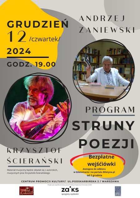 Program „Struny Poezji – Krzysztof Ścierański & Andrzej Zaniewski”. Andrzej Zaniewski jest poetą, prozaikiem i autorem wielu tekstów piosenek. Był współtwórcą grupy literackiej HYBRYDY. Jest autorem wielu tomów poezji i prozy. Jego powieść „Szczur” stała się światowym bestsellerem. Pod wspólnym pseudonimem Piotr Trojka wraz z Bogdanem Loeblem i Stanisławem Cejrowskim napisał wiele piosenek. „Żagiel Ziemi” dla zespołu Breakout , „Droga ludzi” dla Skaldów i „ Na brzegu światła” dla zespołu Budka Suflera. Jest laureatem Czerwonej Róży, którą otrzymał w 1966 roku. Zdobył też nagrodę im. W. St. Reymonta. Warstwa muzyczna należeć będzie do Krzysztofa Ścierańskiego – krakowskiego muzyka, gitarzysty i autora własnych utworów. Muzyk współpracował z Markiem Grechutą i krakowskim zespołem jazz-rockowym Laboraturium. Współpracował z Bernardem Maselim, Ewą Bem oraz Tomaszem Stańko. Na zaproszenie Zbigniewa Namysłowskiego przystąpił do zespołu Air Condition. Uczestniczy w projektach Krzesimira Dębskiego. Materiał muzyczny będzie dostosowany do charakteru wydarzenia i składał się będzie z autorskich, muzycznych prac Krzysztofa Ścierańskiego. Projekt jest współfinansowany przez Fundusz Popierania Twórczości ZAiKS. Wstęp: bezpłatne wejściówki dostępne odbioru w biletomacie oraz na portalu BILETYNA.PL od 2 grudnia.