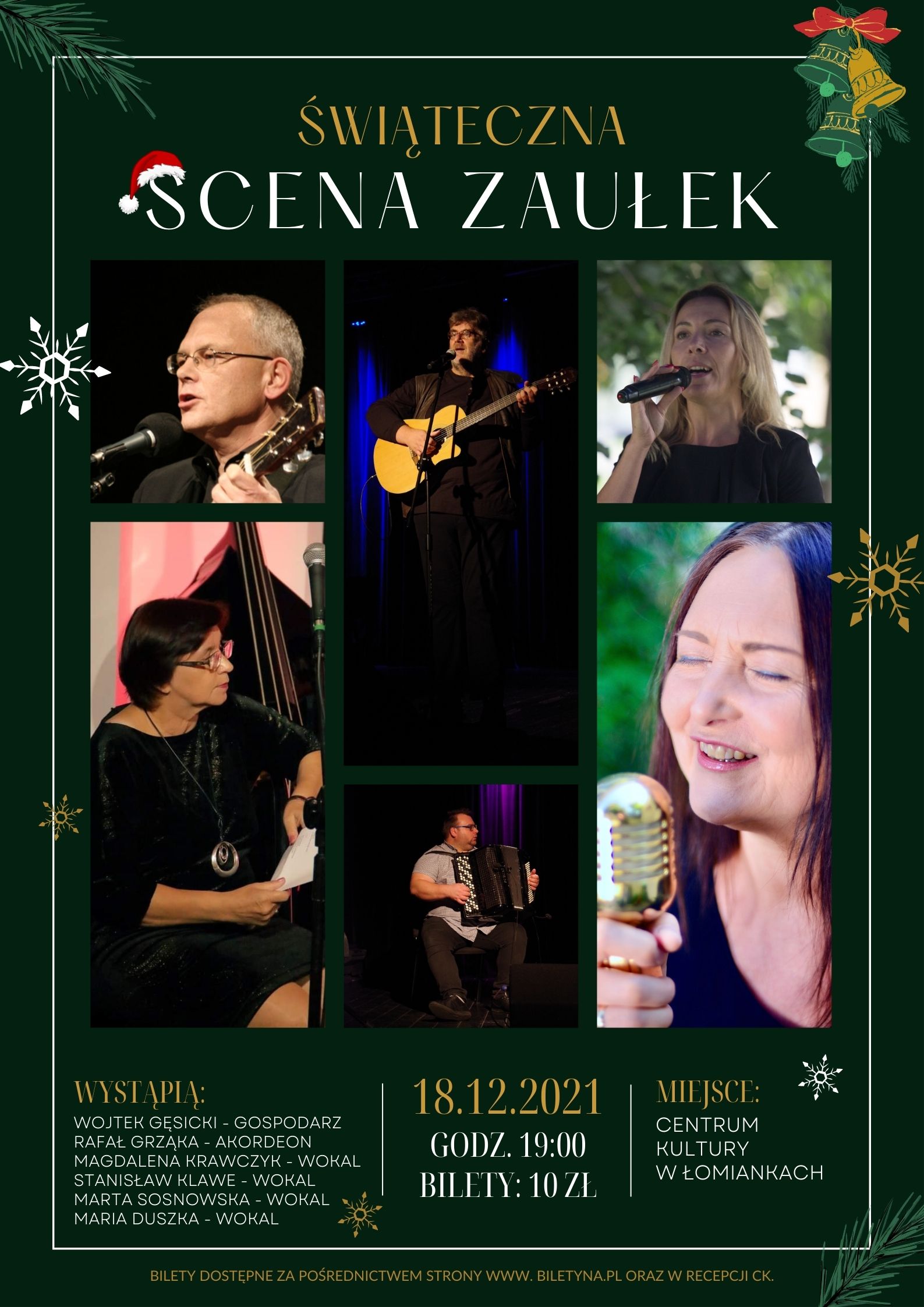 Świąteczna Scena Zaułek, a w niej opowieści wigilijne kilku wspaniałych osobowości: Magdalena Krakowska (Żuk) przez lata związana m.in. z kabaretem Pod Egidą, której na gitarze akompaniował będzie mąż Krzysztof Krakowski; Stanisław Klawe - bard również od lat związany z kabaretem Pod Egidą. W Zaułku przy wigilijnym mikrofonie zagoszczą również: Maria Duszka - poetka i dziennikarka oraz Marta Sosnowska - pedagog i wokalistka. Gospodarzył jak zwykle będzie Wojtek Gęsicki wraz z dr Rafałem Grząką - wirtuozem akordeonu.