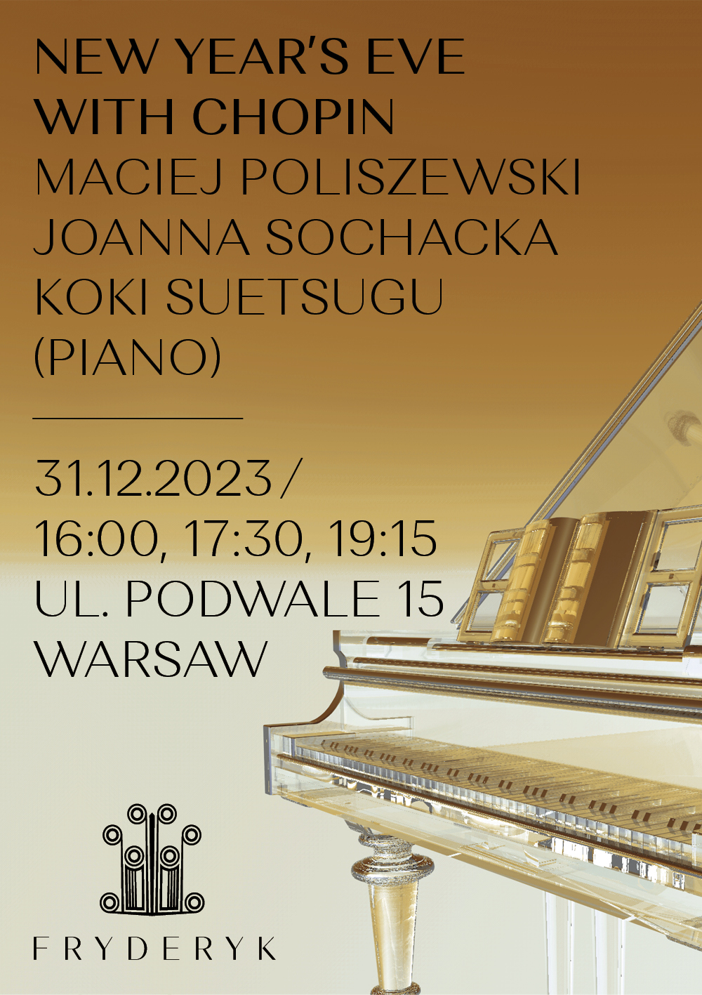 Wieczór Sylwestrowy to niezwykła okazja, aby spędzić ten czarowny czas z rodziną i przyjaciółmi, a także z wyjątkową muzyką Fryderyka Chopina.