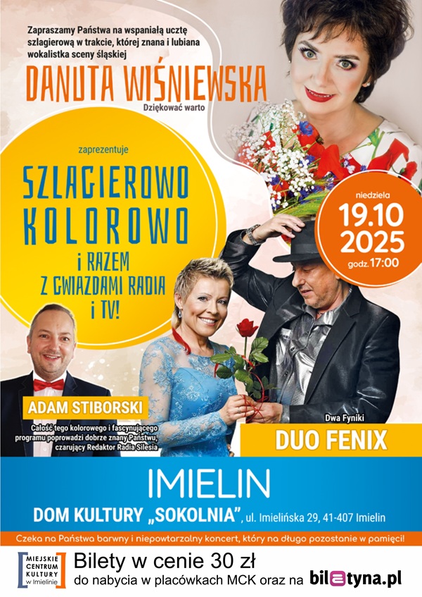 "Szlagierowo, kolorowo i razem z Gwiazdami Radia i TV!" to barwny, niepowtarzalny koncert przepełniony pięknymi strojami, znanymi Państwu utworami z radia i telewizji, a przede wszystkim wspaniałą atmosferą i dużą porcją humoru! Czeka na Państwa najbardziej lubiana przez Publiczność śląska i niemiecka muzyka szlagierowa, prezentowana przez dobrze znanych naszej Publiczności Wykonawców: Danutę Wiśniewską, która zaprezentuje Państwu również utwory ze swojej nowowydanej 2. płyty solowej "Nasza Moc" oraz "Duo Fenix - Dwa Fyniki" znany z Radia i TV! Grupa odnosi liczne sukcesy w radiowych i telewizyjnych listach przebojów w regionalnych stacjach radiowych, telewizyjnych i telewizji TVS. W telewizyjnej Liście Śląskich Szlagierów teledyski duetu miesiącami utrzymywały się w głównej 10. Koncert poprowadzi dobrze znany Państwu Prezenter Radia Silesia z genialnym poczuciem humoru: Adam Stiborski!