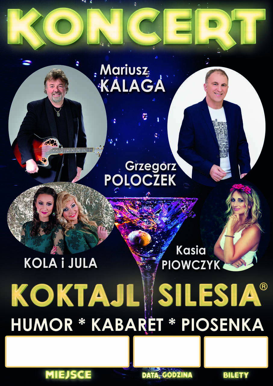 Szlagierowy Koktajl Silesia to spektakl kabaretowo-muzyczny przeznaczony dla wszystkich lubiących wyśmienity humor, dobrą piosenkę oraz dobrą zabawę, którą zapewni mieszanka profesjonalnych artystów z wieloletnim doświadczeniem obdarzonych wyjątkowym talentem estradowym i urokiem osobistym.