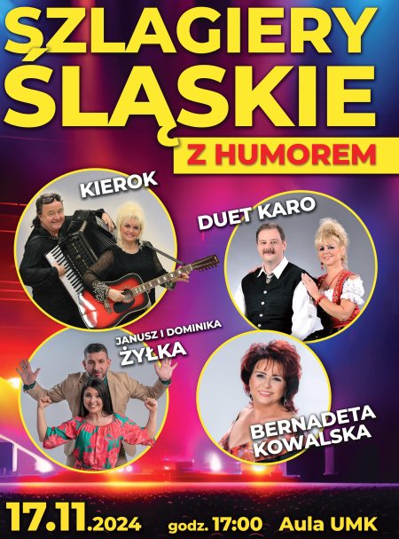 Szlagiery śląskie to znakomite niepowtarzalne muzyczne show i doskonała zabawa. Lekka, wesoła i prosta muzyka, jej przyjemne brzmienie, regionalny język, humor i ogromna dawka pozytywnej energii – to bez wątpienia wielki atut, który sprawia, że każdy koncert jest jedyny i niepowtarzalny. Pojawi się plejada najbardziej znanych i lubianych gwiazd znanych z rozgłośni radiowych i stacji telewizyjnych. występują Duet Karo, Jolanta i Jacek Kierok, Janusz i Dominika Żyłka, Bernadeta Kowalska. Duża dawka lubianych śląskich szlagierów i humor sprawi ,ze będzie to radosne, roztańczone i rozśpiewane , wspólnie spędzone 2 h.