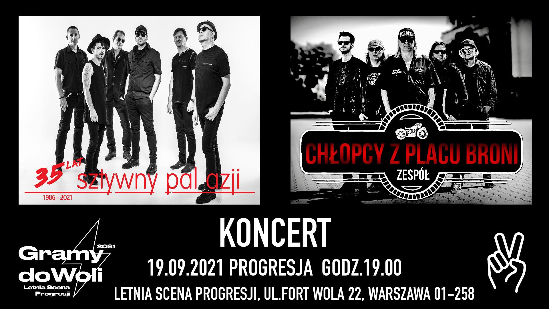 W plenerze, bo w ogrodach Progresji, na Letniej Scenie Progresji, swoje największe przeboje zaprezentują dwie muzyczne ikony polskiego rocka lat 80tych: Sztywny Pal Azji i Chłopcy z Placu Broni.