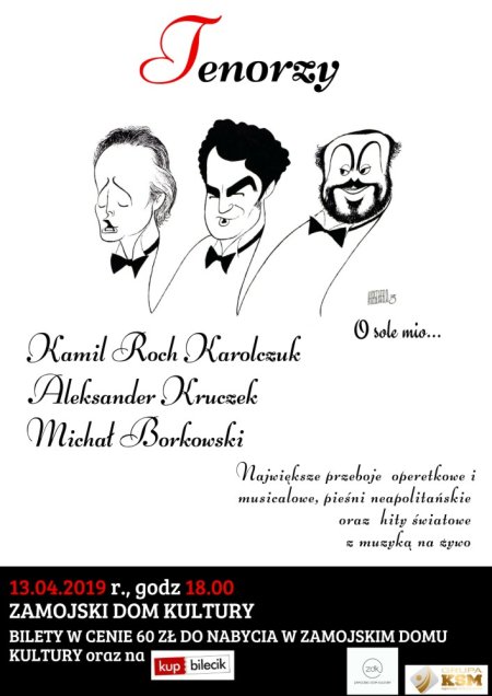 Tenorzy, to artyści młodego pokolenia. Artyści występujący na największych scenach operowych i operetkowych Polski i Europy, którzy obdarzeni są wspaniałą barwą głosu, która jest uwielbiana przez wszystkich melomanów na świecie. Przeniosą oni Państwa do zaczarowanego świata opery, operetki i musicalu. Usłyszą Państwo przepiękne arie operetkowe, pieśni neapolitańskie i musicalowe oraz największe hity rangi światowej. Tenorom towarzyszy kameralny Zespół Straussowski, występujący na co dzień na największych estradach Polski i Europy. Usłyszycie m.in. Brunetki blondynki, Wielka sława to żart... czy O sole mio...A to wszystko podane na najwyższym poziomie, z krztą dobrego humoru. Tego nie można przegapić.