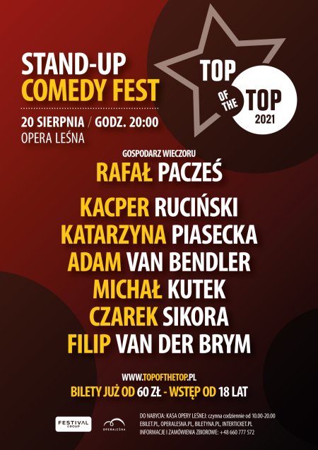 W ramach Top of the Top Stand-up Comedy Fest wystąpi czołówka polskiego stand-upu. Wśród doskonałych komików będzie można zobaczyć takich artystów, jak Rafał Pacześ (gospodarz wieczoru), Kacper Ruciński, Katarzyna Piasecka, Adam Van Bendler, Michał Kutek, Czarek Sikora i Filip Van Der Brym.