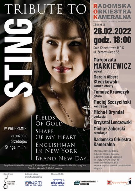 TRIBUTE TO STING to projekt Małgorzaty Markiewicz, wokalistki, flecistki jazzowej, songwriterki, w którym artystka składa swój muzyczny hołd wielkiemu twórcy światowych przebojów – Stingowi. W koncercie można będzie usłyszeć najbardziej znane, legendarne utwory takie jak „Englishman In New York”, „Fields Of Gold”, „Brand New Day”, „Shape Of My Heart”, jak również mniej znane kompozycje, sięgające okresu zespołu The Police, jak i początków solowej kariery brytyjskiego wokalisty. Piosenkarce na scenie towarzyszyć będą znani muzycy z polskiej sceny jazzowej oraz alternatywy. Klasyczne trio gitara, bas i perkusja wzbogacona jest o kornet, flet irlandzki a także orkiestrę smyczkową, której rolę spełni Radomska Orkiestra Kameralna. Koncert jest wzbogacony o efekty wizualne, nawiązujące do treści i nastroju utworów.