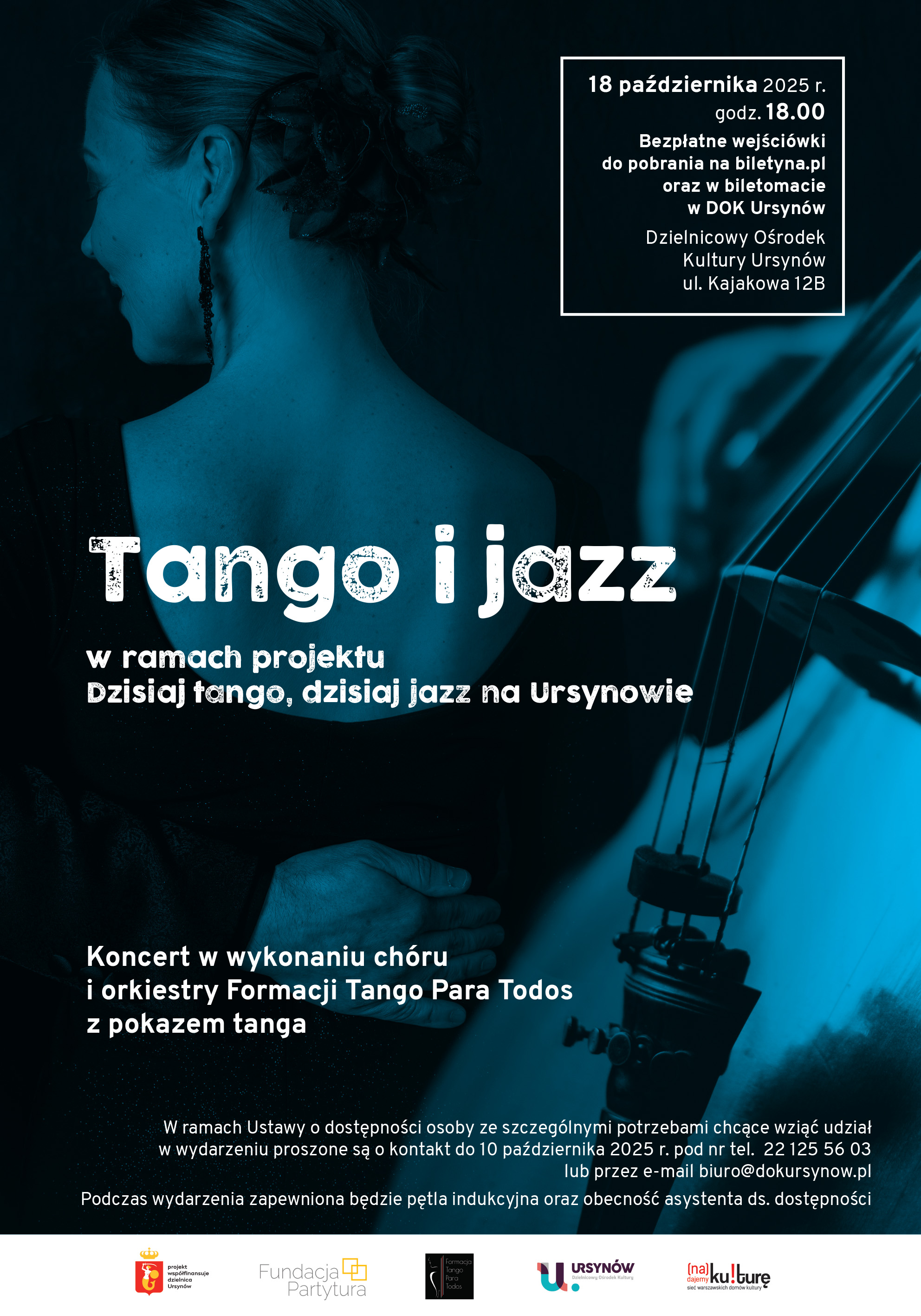 Fundacja Partytura i Dzielnicowy Ośrodek Kultury Ursynów zapraszają 18 października 2025 r. o godz. 18.00 na koncert w wykonaniu chóru i orkiestry zespołu Formacja Tango Para Todos pt. "Tango i jazz " w ramach projektu „Dzisiaj tango, dzisiaj jazz na Ursynowie”. Zespół zaprezentuje tanga klasyczne i nowoczesne, a wśród nich kilka standardów jazzowych zaaranżowanych na tangowo, np. „Cheek to cheek”, czy „Autumn leaves”. Podczas koncertu do wybranych utworów zatańczy para tancerzy.