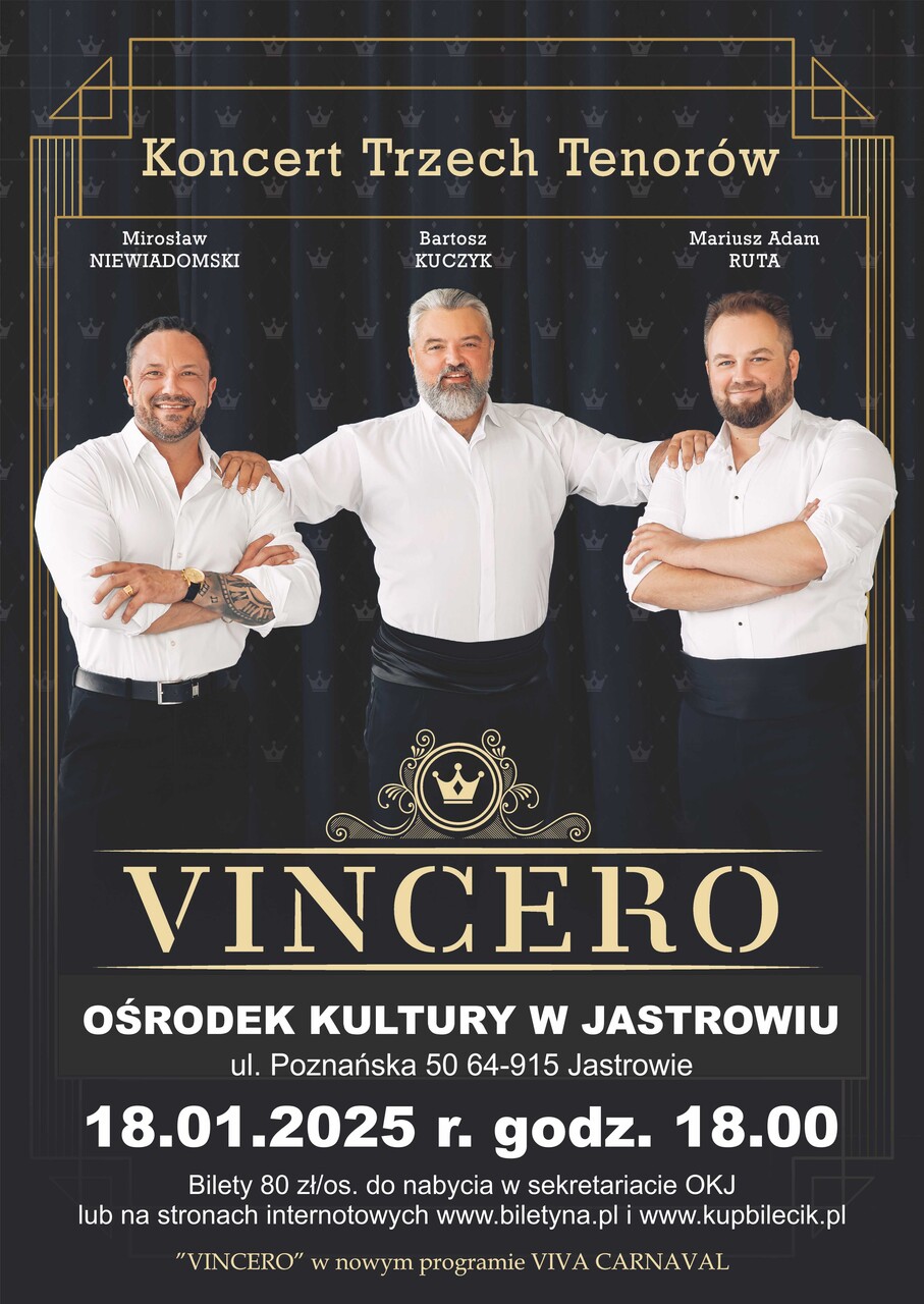Jeśli stronisz od poważnych koncertów, wymagających skupienia i zastanawiania się nad odwiecznym pytaniem "co artysta miał na myśli..." to dobrze trafiłeś. Formacja "Vincero" czyli trzech tenorów to właśnie odpowiedź na takie wydarzenia. Trzech Mężczyzn, których jednoczy pasja śpiewu, poczucie humoru i pozasceniczna przyjaźń, przenosząca się na scenę. Zdarza się, że podczas koncertu wykonawcy nie szczędzą sobie wzajemnie żartów i uwag na swój temat, podstawą jest interakcja z publicznością, a wszystko oparte o repertuar dobrany w taki sposób, aby obok klasycznych arii operetkowych czy operowych rozbrzmiewały przeboje muzyki, rozrywkowej, arie włoskie, piosenki Elvisa Presleya, Franka Sinatry, Beatlesow czy Royal Orbisona-krótkim słowem pozytywna mieszanka muzyczna. I co najważniejsze, publiczność nie tylko słucha, ale przede wszystkim śpiewa z wykonawcami i dobrze się bawi, dzięki lekkiej i dostosowanej do danej chwili konferansjerce. Trzech tenorów - elegancki, przystojny, obdarzony ciemną uwodzicielską barwą Mirosław Niewiadomski, romantyczny pełen wdzięku scenicznego obdarzony liryczną barwą Mariusz Ruta oraz przeplatający różnorodny repertuar w swoim wykonaniu, bawiący anegdotami i humorem złotousty konferansjer Bartosz Kuczyk ( mówi się, że również nieźle śpiewa ) to jedyne w swoim rodzaju trio. Wspólne lata na scenie zaowocowały setkami koncertów, czy to z zespołem, orkiestrą czy podkładami orkiestrowymi. Odnajdują się zarówno na scenach oper czy filharmonii, by następnego dnia bawić się i czerpać radość z występu w małej wiejskiej sali czy w plenerze. Kochają śpiew, publiczność i dobrą zabawę. Obojętnie czy przebierają się w klimatyzowanej garderobie czy w namiocie zawsze są tacy sami. Pogodni, uśmiechnięci i znakomicie śpiewający. Nie istnieją dla nich przeciwności podczas występu, oni zmieniają je w atrybuty chwili. Po prostu zawsze są na 100 %.