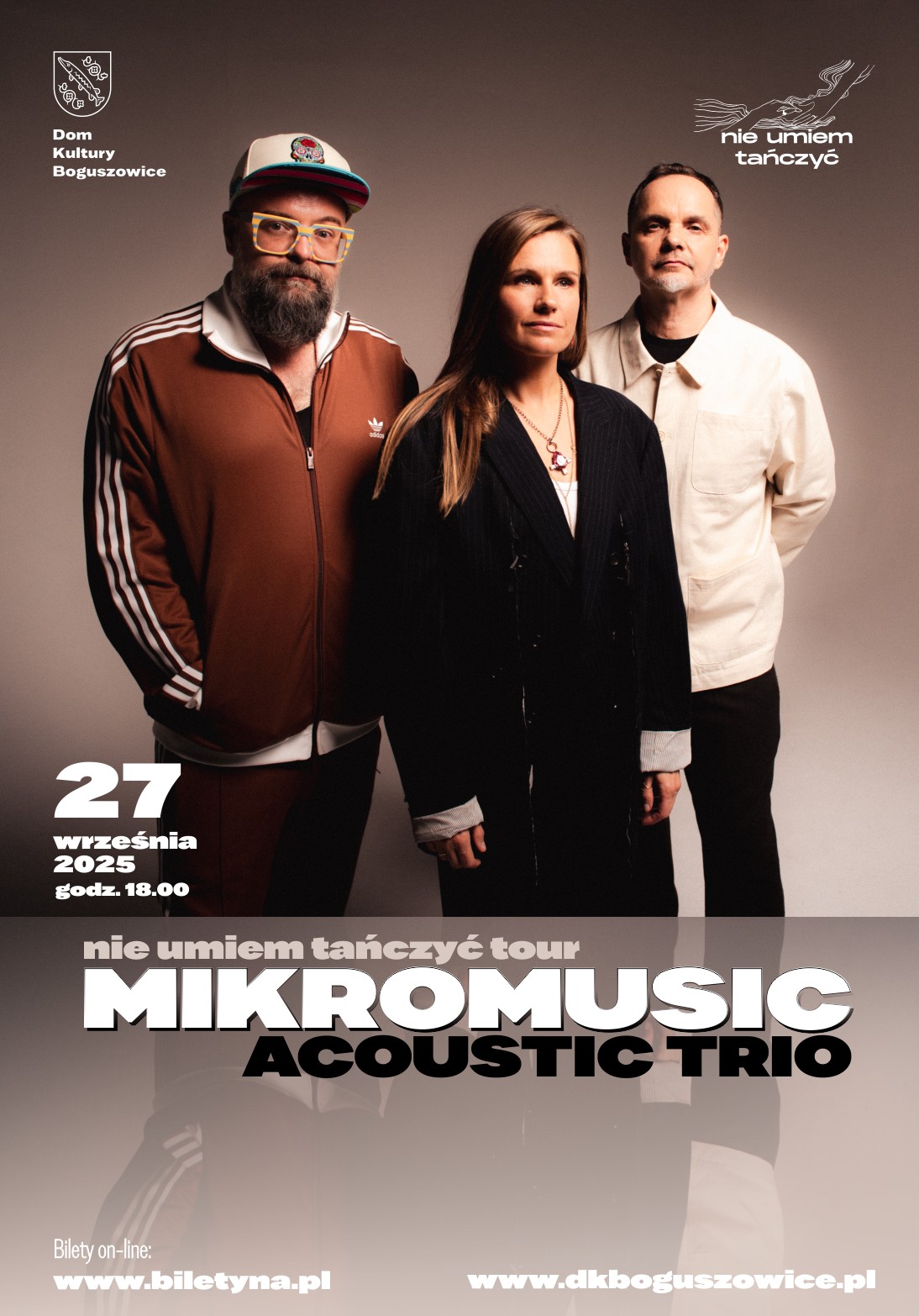 „Nie umiem tańczyć tour” to niezwykłe koncerty w kameralnej, akustycznej aranżacji. W naszym mieście zespół wystąpi w trzyosobowym składzie, koncentrując całą magię swojej muzyki w intymnej atmosferze. Podczas występów fani po raz pierwszy usłyszą na żywo utwory z „Nie umiem tańczyć”. Wśród nich znajdą się emocjonalne „Wkurzasz mnie”, miłosna laurka „Nie biłeś się nigdy o mnie” oraz ekosingiel „Jestem rzeką”, nagrany we współpracy z Belą Komoszyńską, Bovską i Marceliną. Nie zabraknie również największych hitów i ulubionych piosenek publiczności! Widowisko zgrabnie połączy nadchodzącą erę Mikromusic z ich wcześniejszą twórczością.