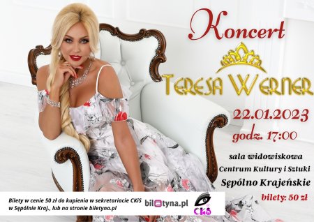 Święta za pasem, Nowy Rok na horyzoncie a wraz z nim kolejne okazje do świętowania i kolejne okazje do obdarowywania najbliższych. Zrób więc prezent sobie lub członkom swojej rodziny już dziś – oto jedna z naszych propozycji! 22 stycznia, w Dzień Dziadka, w Centrum Kultury i Sztuki wystąpi Teresa Werner. Doskonale znana lokalnej publiczności piosenkarka, która gościła w naszym mieście niejednokrotnie, a jej koncerty każdorazowo wyprzedawały się z dużym wyprzedzeniem. Dlatego nie zwlekaj, kup bilet dla Babci, Dziadka lub dla siebie już teraz. Podaruj go bliskim pod choinkę i bawcie się wspólnie!