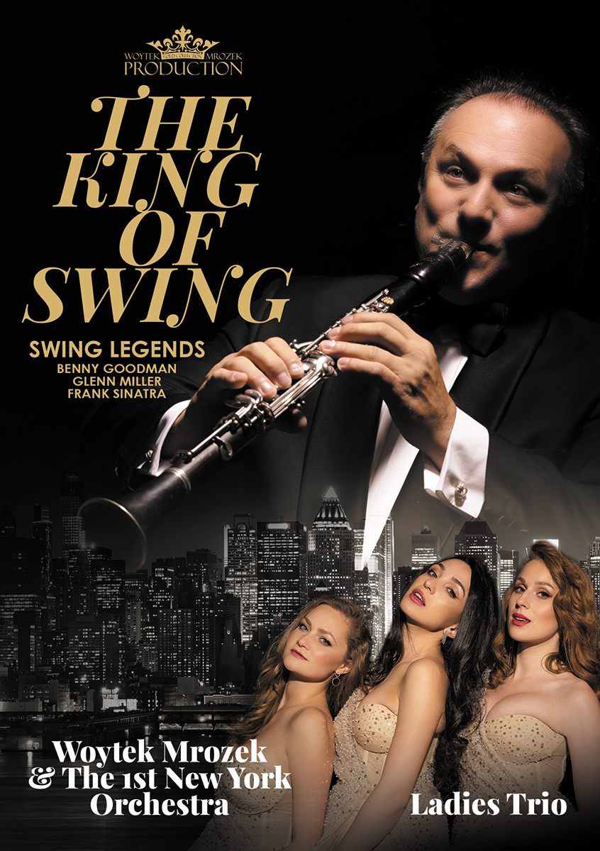 W tym unikalnym i jedynym na świecie projekcie Maestro Woytek Mrozek zaprezentuje najpiękniejsze kompozycje z repertuaru legendarnych orkiestr swingowych: Benny Goodman Orchestra, Glenn Miller Orchestra, Frank Sinatra, Arite Shaw. Entuzjazm i niegasnąca miłość Maestro Mrozka do muzyki swingowej oddają ekscytujący, nostalgiczny i niepowtarzalny klimat muzyki początku ubiegłego wieku oraz zamieniają scenę w kolebkę muzyki z początku lat '30 i '50. „The King Of Swing“ to show, którego nie mogą przegapić zarówno fani jazzu, swingu, jak i nieuleczalni muzyczni romantycy, którzy pragną znaleźć się w wehikule czasu i przenieść się do 1938 roku na legendarny koncert muzyki swingowej w Carnegie Hall w Nowym Yorku, który wykonała Benny Goodmann Orchestra. Prestiżowe występy Maestro Woytk Mrozka to błyskotliwe i precyzyjne brzmienie orkiestry i niepowtarzalna barwa klarnetu splatającego wszystkie partie w jedną całość. Energia, perfekcjonizm i autentyczność artystów sprawiły, że programy Woytka Mrozka zyskały najcenniejszą nagrodę: podziw i owacje na stojąco. W programi gościnnie wystąpią niezwykłe Ladies Trio oraz Maksymilian Mrozek. Barwa głosów tych artyystów idealnie wciela się w styl i klimat muzyki swingowej. Kiedy słuchacz zamknie oczy usłyszy barwy głosów Andrew Sisters czy Deana Martina.