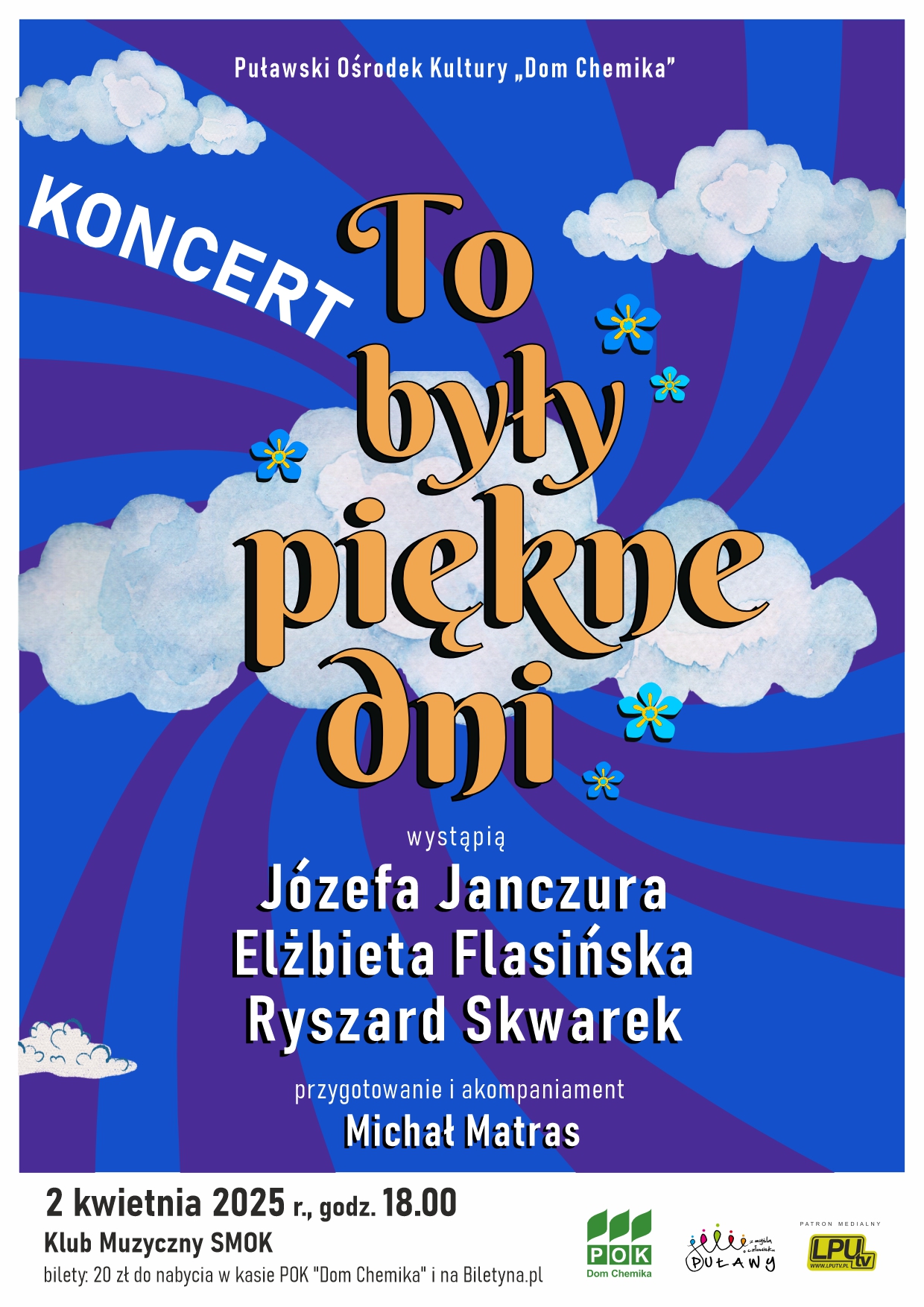 Pozwól sobie na chwilę nostalgii i ciepłych wspomnień przy dźwiękach piosenek, które kiedyś nuciła cała Polska! 2 kwietnia melodie znanych i lubianych przebojów po raz kolejny wypełnią przestrzeń Klubu Muzycznego SMOK, a to za sprawą wyjątkowego koncertu pt. „To były piękne dni". Będzie to doskonała okazja, by na chwilę zatrzymać się w codziennym pędzie i oddać się magii ponadczasowych utworów polskich artystów.