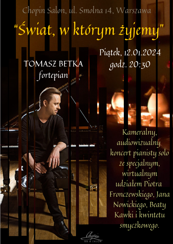 Autorski, audiowizualny koncert pianisty Tomasza Betki ze specjalnym, wirtualnym udziałem Piotra Fronczewskiego, Jana Nowickiego, Beaty Kawki oraz kwintetu smyczkowego.