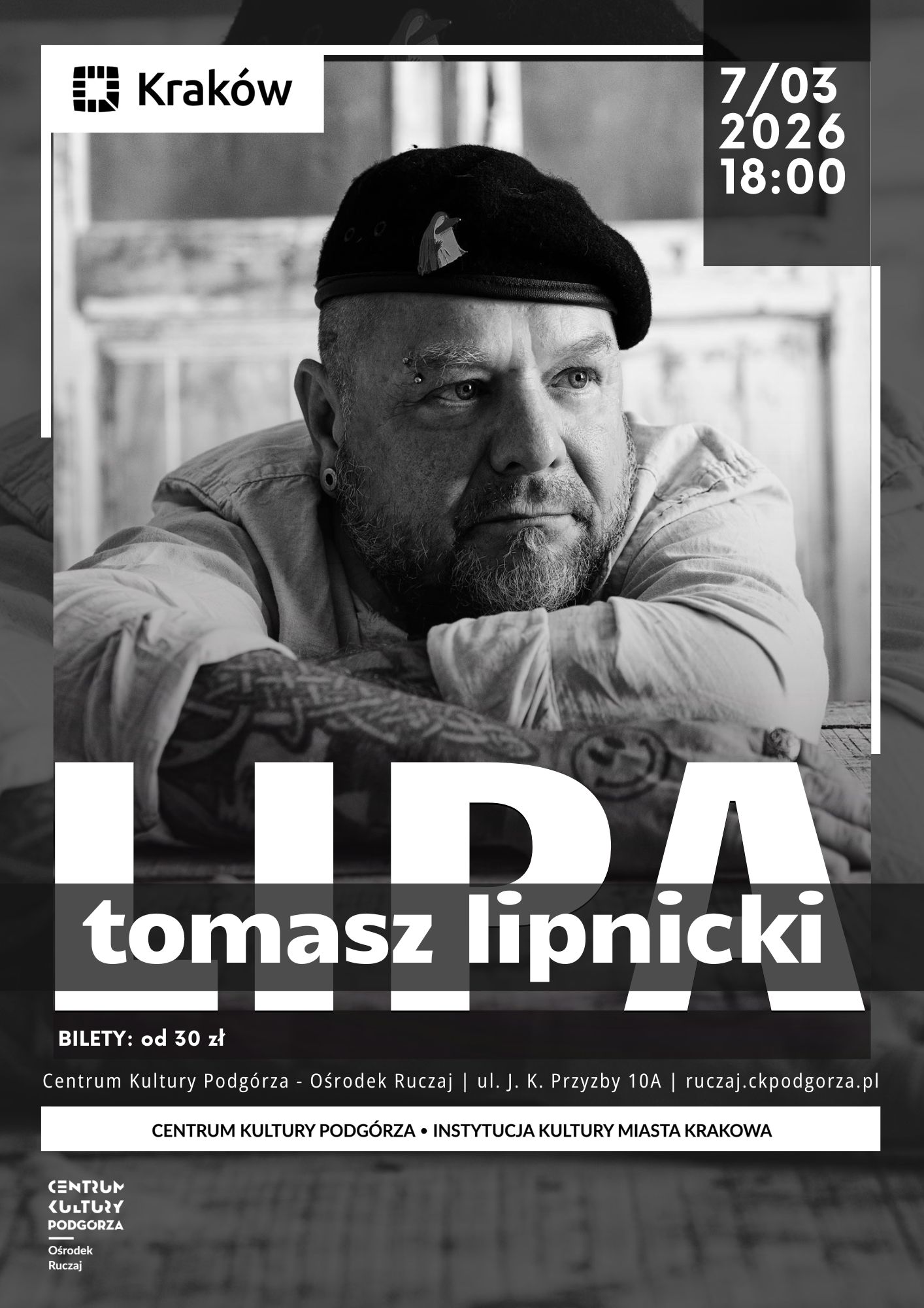 Tomasz LIPA Lipnicki w ramach solowej trasy koncertowej 2026 promującej płytę "Pola bitew" wystąpi w Ośrodku Ruczaj 7 marca 2026 roku o godzinie 18:00.