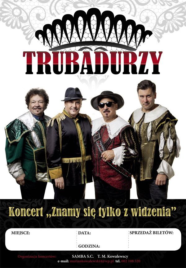 Trubadurzy to legendarny zespół, których piosenki śpiewała cała Polska takie jak: Znamy się tylko z widzenia, Przyjedź mamo na przysięgę, Kasia, Nie przynoś mi kwiatów dziewczyno, Krajobrazy i wiele innych.
