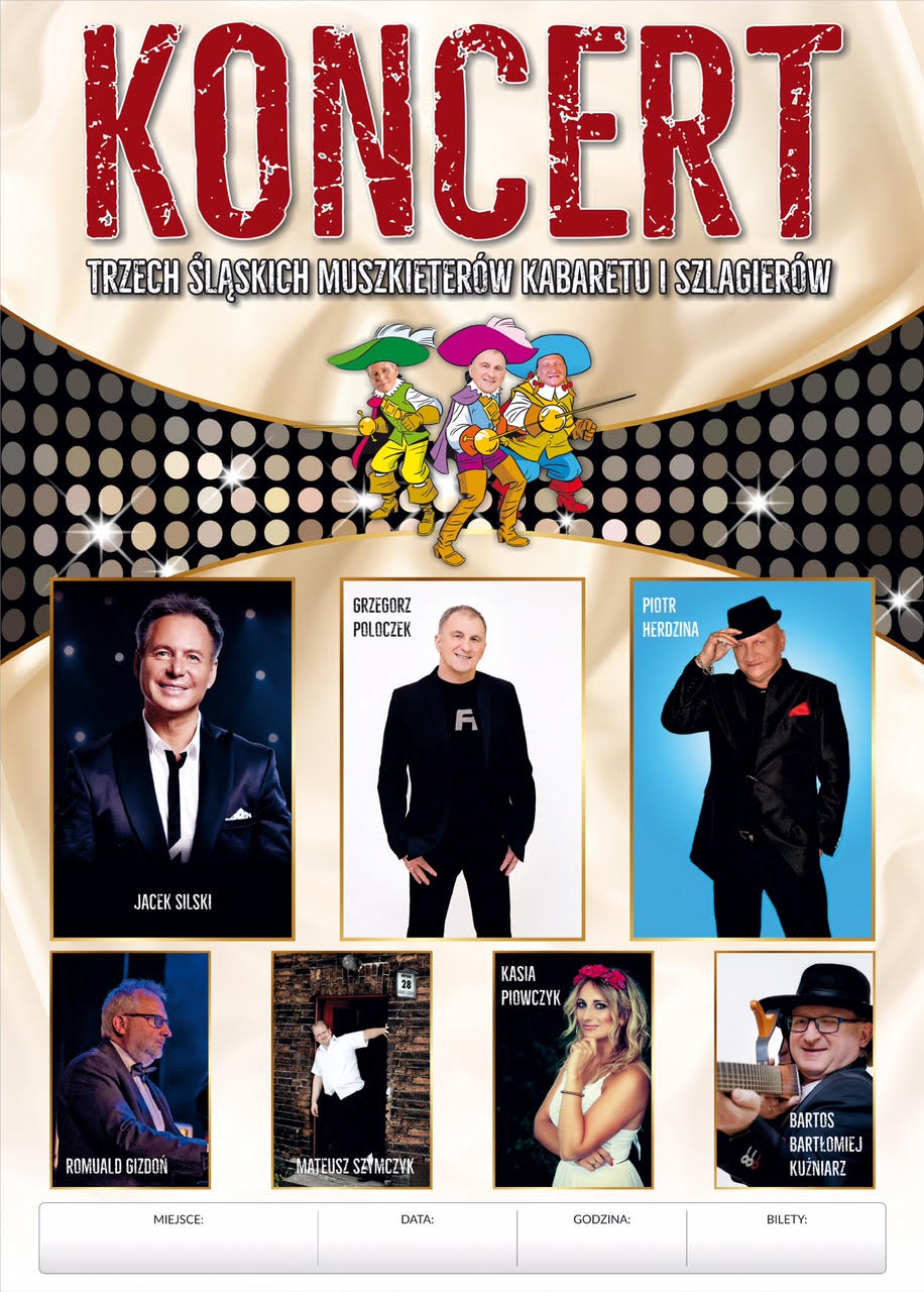 Koncert "Trzech Śląskich Muszkieterów Kabaretu i Szlagierów", to niezwykły projekt, w którym każdy znajdzie coś dla siebie! Na scenie będzie można zobaczyć Grzegorza Poloczka, Jacka Silskiego, Piotra Herdzinę. Każdy z tych artystów jest inny i każdy z nich ma zupełnie różny repertuar. Pojawią się również takie osobistości jak Kasia Piowczyk, Mateusz Szymczyk, Romuald Gizdoń i Bartłomiej Kuźnierz. Gwarantujemy dobry humor i sporo znakomitej muzyki.