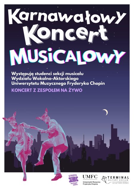 Studenci sekcji musicalowej Wydziału Wokalno-Aktorskiego Uniwersytetu Muzycznego Fryderyka Chopina serdecznie zapraszają na koncert karnawałowy. W programie zarówno najbardziej znane, jak i te najnowsze - czyli jeszcze mniej rozpoznane, lecz nie mniej piękne - arie i songi musicalowe.