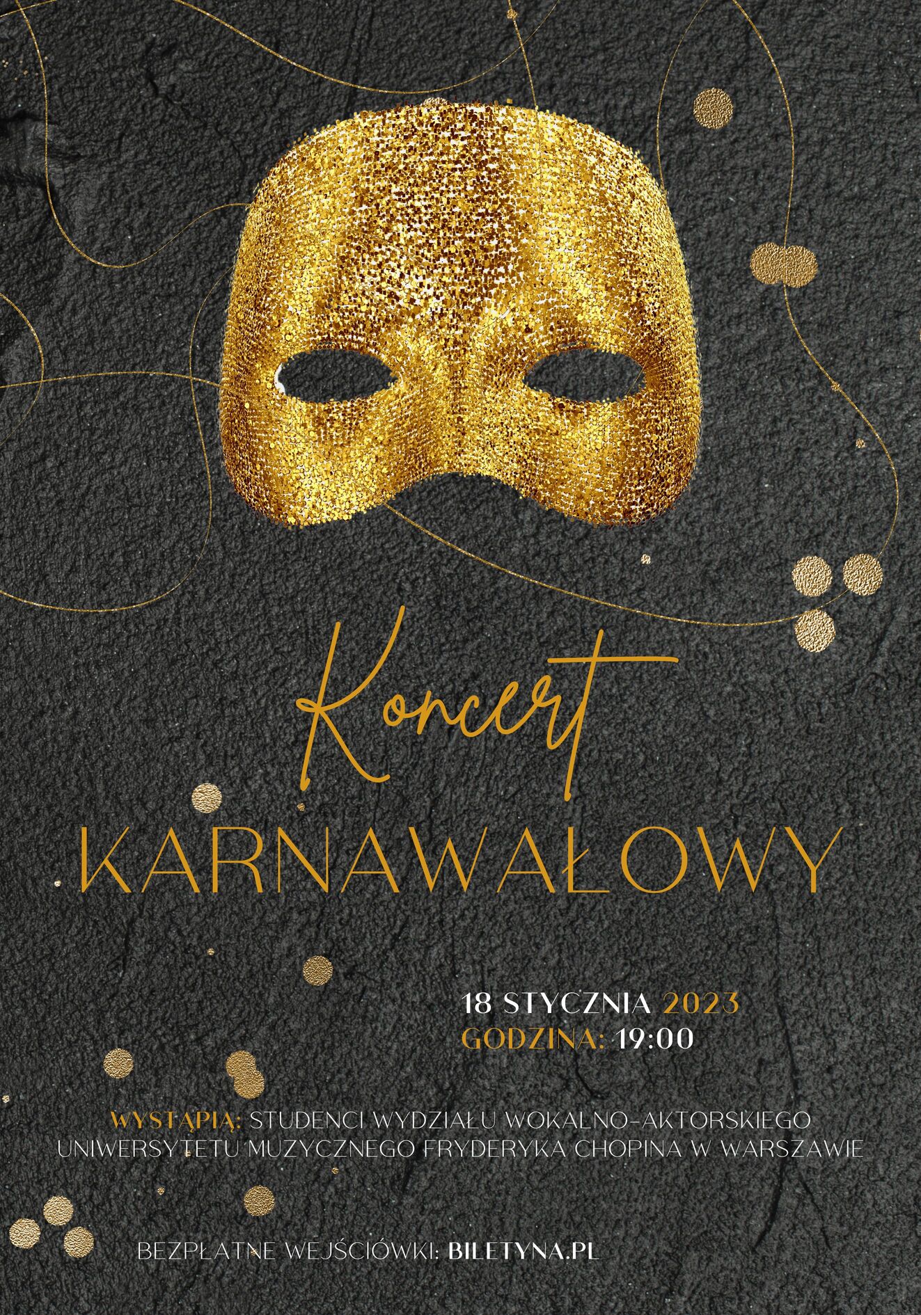 Studenci sekcji musicalowej Wydziału Wokalno-Aktorskiego Uniwersytetu Muzycznego Fryderyka Chopina serdecznie zapraszają na koncert karnawałowy. W programie zarówno najbardziej znane, jak i te najnowsze czyli jeszcze mniej rozpoznane, lecz nie mniej piękne arie i songi musicalowe.