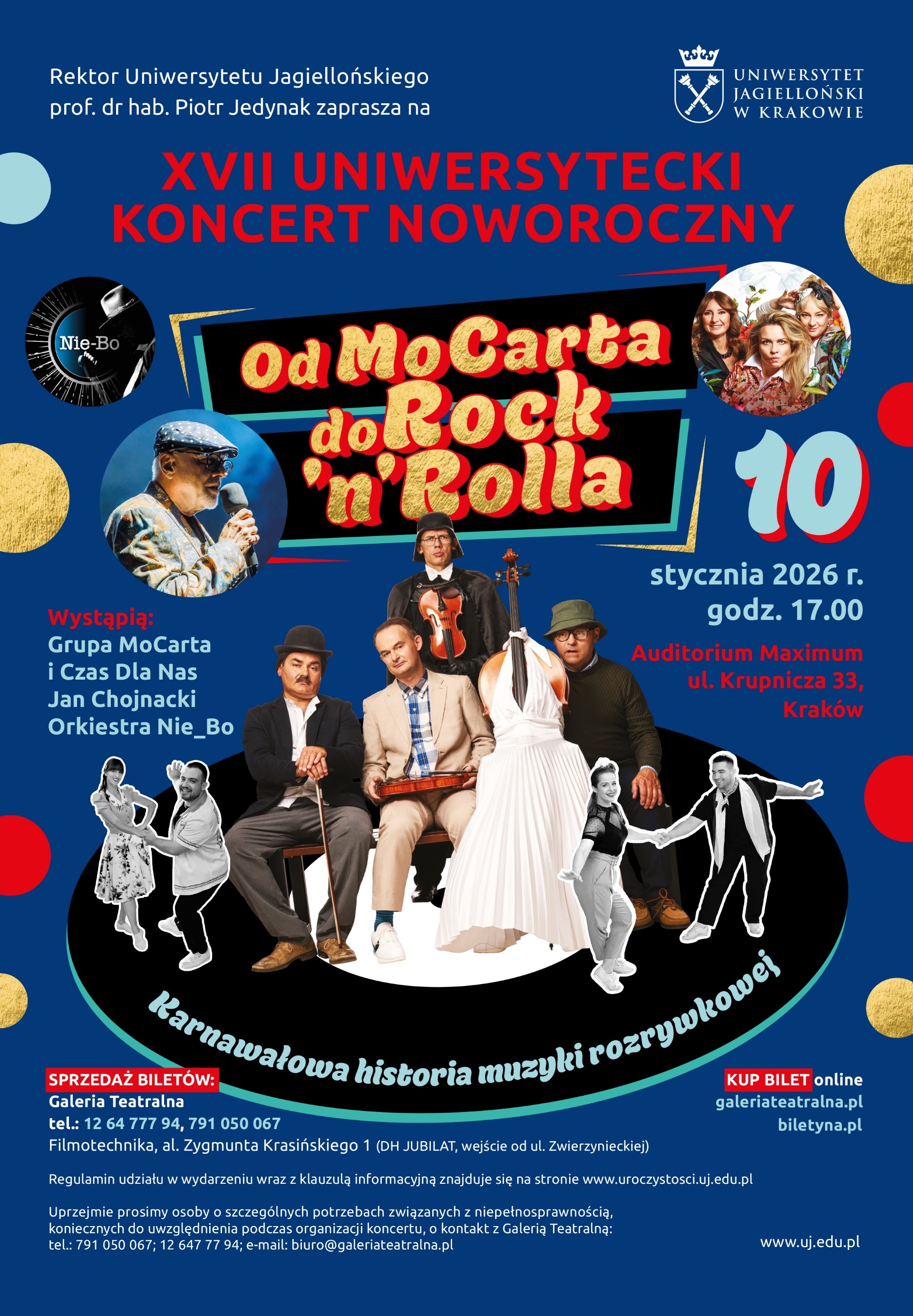 Uniwersytecki Koncert Noworoczny to wyjątkowa tradycja środowiska akademickiego Krakowa, łącząca muzykę, humor i elegancję. Podczas XVII edycji pt. Od MoCarta do Rock'n'Rolla na scenie Auditorium Maximum UJ wystąpią: Grupa MoCarta z programem Ale Kino!, w którym wykona przeboje muzyki filmowej w swoim niepowtarzalnym stylu. Wydarzenie wzbogaci trio wokalno-kabaretowe Czas Dla Nas, które wprowadzi publiczność w świat pełen dowcipu i muzycznych niespodzianek. Spektakl, łączący kabaret i koncert, to autorski projekt Filipa Jaślara, który zadbał o scenariusz i reżyserię. Publiczność usłyszy znakomite głosy: operowy - Agnieszki Kowaluk, jazzowy - Doroty Jaremy i radiowy – Anety Jaślar. Występ dopełnią mistrzowskie aranżacje na instrumenty klawiszowe - Maciej Błaszczyk. W piękną, sentymentalną podróż do świata rock and rolla zabierze nas Jan Chojnacki – legenda polskiej sceny muzycznej, radiowej Trójki oraz Radia Nowy Świat. Muzycznych doznań dostarczy Orkiestra Nie-Bo wraz ze znakomitymi wokalistami: Żanetą Luberą, Natalią Kwiatkowską, Robertem Luberą, Bartłomiejem Szopińskim i Bartkiem Grzankiem. Wieczór uświetnią również pokazy tancerzy klubu Swing Step – najbardziej doświadczonej utytułowanej grupy specjalizującej się w rytmach boogie woogie i rock and rolla.
