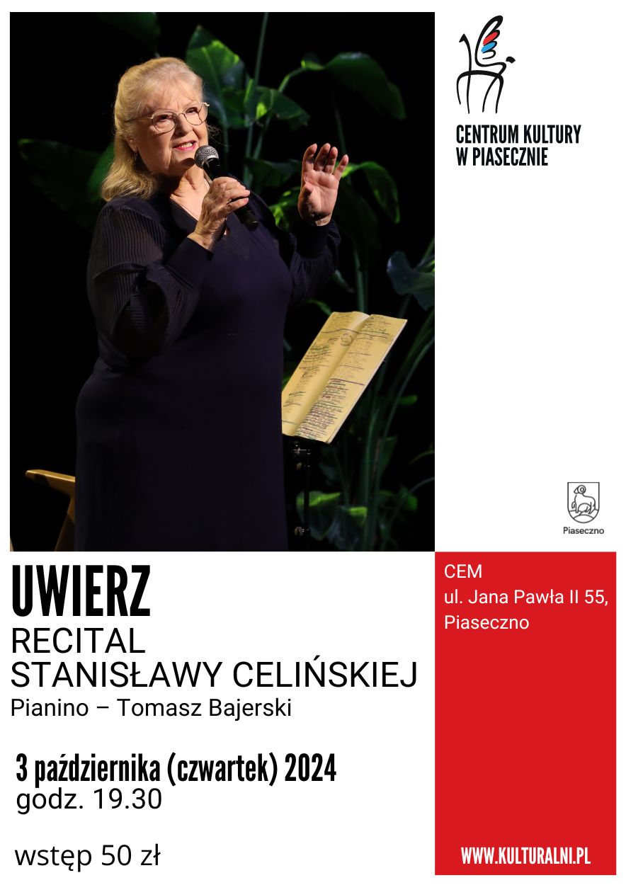 Stanisława Celińska traktuje ten koncert jak podsumowanie całego jej życia – prywatnego i zawodowego. Cyfry, które towarzyszą koncertowi to cyfry magiczne: 77 lat życia, 55 lat pracy artystycznej i 40 lat współpracy z kompozytorem Tomaszem Bajerskim. Ich pierwsza premiera odbyła się w 1984 roku, w dniu pogrzebu Księdza Jerzego Popiełuszki. Była to „Księga Hioba” w tłumaczeniu Czesława Miłosza. Koncert zatytułowany „Uwierz” będzie kolorowy, tak jak kolorowe jest życie, a życie Stanisławy Celińskiej było i jest barwne. W zawodzie aktorskim stosowała „płodozmian” czyli oprócz ról dramatycznych grała role komediowe, charakterystyczne. Tak będzie i w tym koncercie. To będą Jej szczere wypowiedzi na ważne tematy, połączone z muzyką, która te tematy podkreśla, nadaje im wyjątkowy klimat i pozwala przeniknąć do serc słuchaczy. Te teksty to Jej przemyślenia, ale też żarty muzyczne. Zapraszamy Państwa do podróży poprzez teksty Stanisławy Celińskiej i Jej ukochane wiersze Leopolda Staffa, a wszystko to będzie płynąć z przepiękną muzyką Tomasza Bajerskiego.