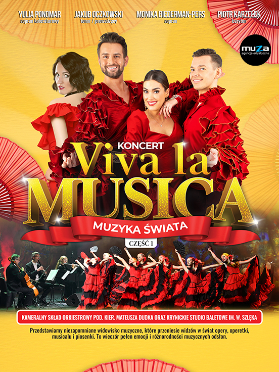 "Viva la Musica" to prawdziwe święto sztuki, w którym piękne melodie splatają się z fascynującymi kostiumami i talentem artystów, którzy na co dzień podbijają sceny całego świata. Przygotujcie się na spektakl, który porwie Was w wir emocji dzięki porywającym choreografiom i niezwykłym aranżacjom orkiestrowym.