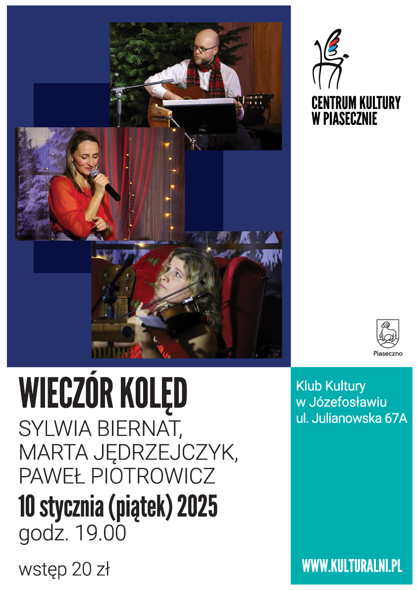 Zapraszamy na Wieczór Kolęd w wykonaniu artystów piaseczyńskich. W repertuarze znajdą się klasyczne kolędy, folkowe pastorałki oraz autorskie utwory świąteczne. Artyści wykonają utwory na klasycznych instrumentach takich jak gitara, skrzypce czy pianino, ale pojawią się również instrumenty folkowe takie jak fidel płocka czy niecodzienny szuflabas.
