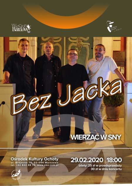 Koncert czołowego zespołu piosenki turystycznej i poezji śpiewanej. Grupa owiana legendą, związaną ze śmiercią jednego z członków zespołu Jacka Stefańskiego za każdym razem przyciąga na swoje koncerty setki fanów. Największym atutem zespołu jest siła przekazu, która sprawia, że muzyki tworzonej grupę Bez Jacka słucha się z niesamowitym zaangażowaniem. Charakterystyczne brzmienie “Bez Jacka” to niesamowity tembr głosu Zbyszka, poezja najwyższego lotu w towarzystwie gitary dwunastostrunowej i liryczny flet. Usłyszymy głównie utwory z ostatniej płyty zespołu „Wierząc w sny” wydanej w 2017 r oraz kilka starszych, mniej znanych, a także tych najbardziej rozpoznawalnych.
