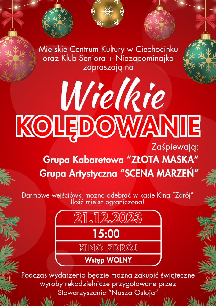 Miejskie Centrum Kultury w Ciechocinku oraz Klub Senior+ "Niezapominajka" serdecznie zapraszają na "Wielkie Kolędowanie"!