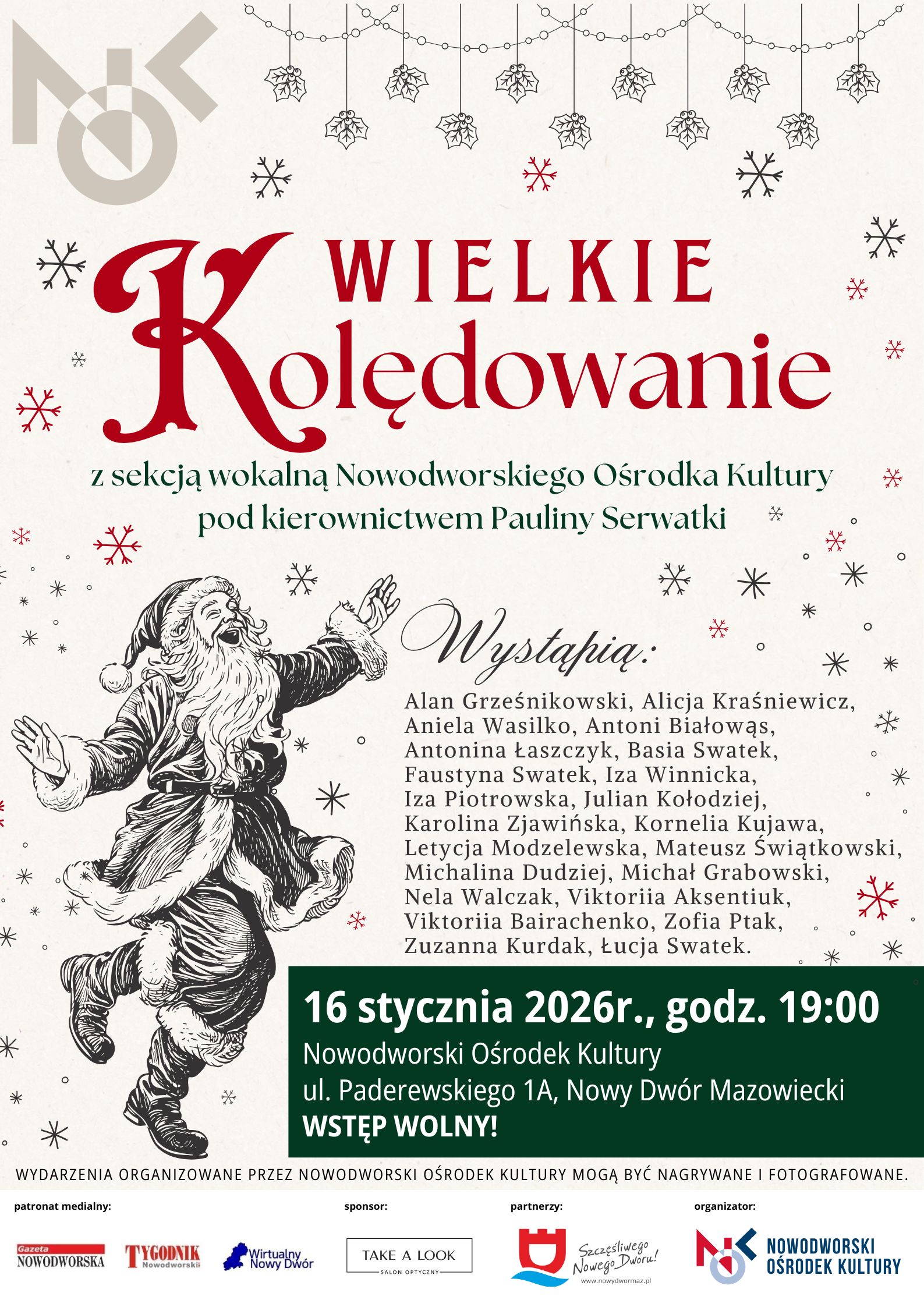 Zapraszamy na WIELKIE KOLĘDOWANIE z sekcją wokalną Nowodworskiego Ośrodka Kultury pod kierownictwem Pauliny Serwatki.