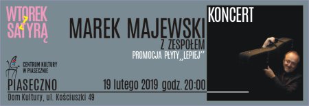 Zapraszamy na WTOREK Z SATYRĄ, czyli Marek Majewski zaprasza. Podczas wydarzenia odbędzie się koncert Marka Majewskiego z zespołem, który będzie promował płytę "Lepiej".