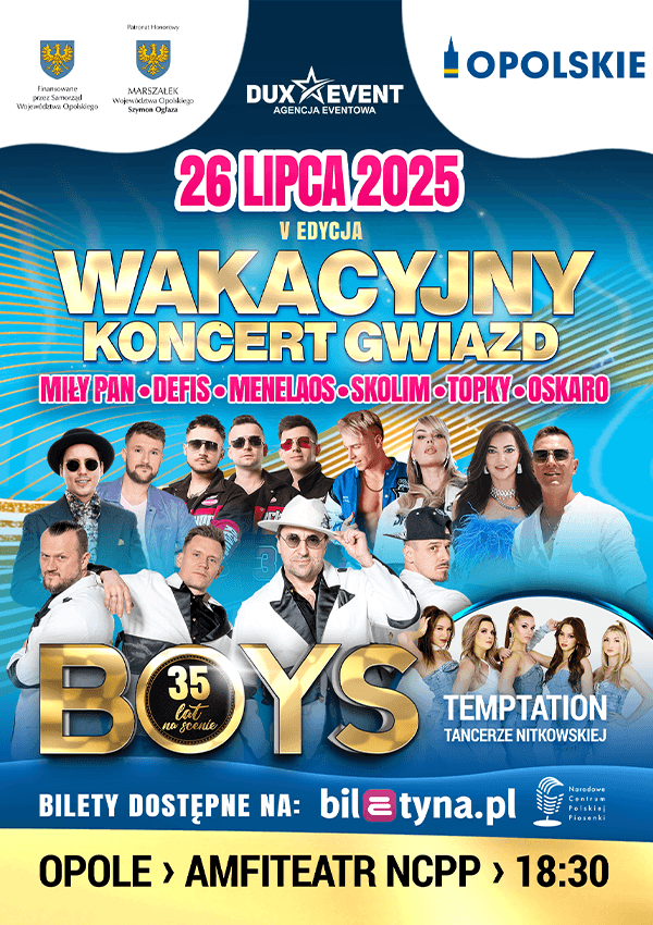 🔥 Wakacyjny Koncert Gwiazd – Opole 2025! 🔥 26 lipca w Amfiteatrze NCPP usłysz BOYS, SKOLIMA, DEFISA i innych! 🎶💃 4 godziny tanecznych hitów i niezapomniana energia! 🎟️
