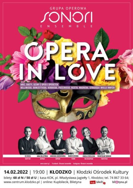 Tematem przewodnim koncertu jest miłość i jej rozmaite odcienie, ukazane przez najsłynniejszych kompozytorów operowych. W programie nie zabraknie lirycznych romansów, duetów i scen miłosnych, brawurowych i efektownych popisów wokalnych oraz odrobiny subtelnego dowcipu. Śpiewacy zaprezentują ponadczasowe przeboje z dzieł najsłynniejszych kompozytorów m. in. Mozarta, Rossiniego, Verdiego, Pucciniego, Wagnera, Straussa, Kalmana, Gershwina i innych. Zapraszamy na niepowtarzalny wieczór operowy pełen emocji i uczuć w towarzystwie wspaniałych głosów operowych! Gala „Opera in Love” to wspaniały prezent Walentynkowy i nie tylko!