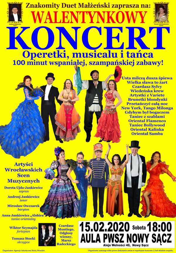 Piękne głosy, wspaniałe tańce, bajeczne stylowe kostiumy, humor, wdzięk, wyjątkowa muzykalność, niespotykany temperament sceniczny, znakomity kontakt z publicznością a także przebogaty program koncertu. To wszystko zapewnią Państwu Artyści Wrocławskich Scen Muzycznych w ponad 100-minutowym Koncercie Walentynkowym. Zapraszamy do wspólnej zabawy w najlepszym stylu z gwarancją artystycznych wrażeń najwyżej klasy.