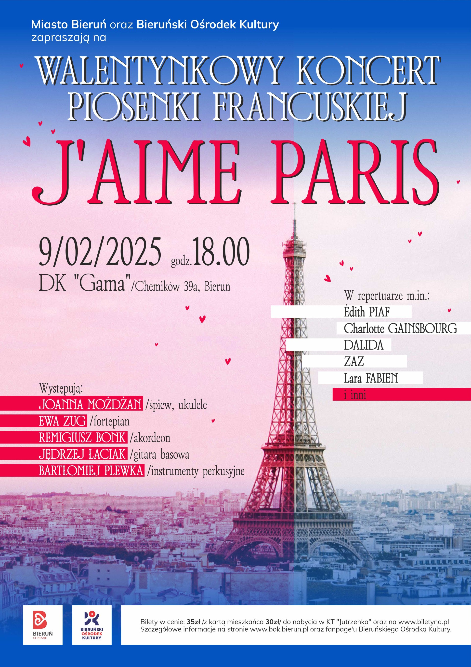 „J'aime Paris" to koncert w wykonaniu Joanny Możdżan wraz z zespołem w składzie: Ewa Zug (fortepian), Remigiusz Bonk (akordeon), Jędrzej Łaciak (gitara basowa) oraz Bartłomiej Plewka (instrumenty perkusyjne). Joanna Możdżan jest absolwentką Akademii Muzycznej im. Karola Szymanowskiego w Katowicach na Wydziale Jazzu i Muzyki Rozrywkowej na kierunku wokalistyka jazzowa. Koncert opowiada o historiach wspaniałych kobiet o bogatym, niebanalnym wnętrzu; ich wątpliwościach, doświadczeniach, radościach, romansach. Artystka chce przywołać pamięcią swoje podróże do ukochanego Paryża. To tam żyjąc, poznała i poczuła lepiej największe utwory div francuskich, które w oparach romańskiej namiętności, opowiadały o najgłębszych emocjach. Dowodzi temu ilości znanych nam, polakom, francuskich utworów. Choć nie rozumiemy większości słów, piosenek tych nie trzeba dosłownie rozumieć, należy je poczuć! Wówczas stanie się jasne, że wszyscy czujemy tak samo.