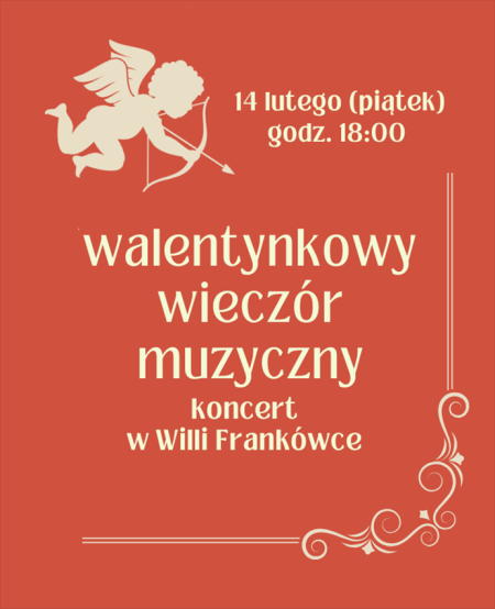 W ten wyjątkowy wieczór zapraszamy do zabytkowych i bardzo romantycznych wnętrz naszego świdermajera. Wieczór uświetni koncert Adama Tkaczyka i Anny Starowicz. Usłyszymy piosenki z autorską muzyką do wierszy poetów: Konstantego Ildefonsa Gałczyńskiego, Jonasza Kofty, Marka Kuszakiewicza, Bolesława Leśmiana, Michała Glinki oraz umiejętnie dodane piosenki z repertuaru polskich artystów. Będą to hity z lat 60. i 70., np. „Czas jak rzeka”, „Spacer dziką plażą”, „Czarny Alibaba”; piosenki okresu międzywojennego, m.in. „Ach Ludwiko” i „Powróćmy jak za dawnych lat”, czy piosenki o zabarwieniu kabaretowym, takie jak: „Ballada o szczęściu”, „Przedszkolak”, „Jestem mały miś”. Mądre, poetyckie teksty i dźwięki gitary oraz skrzypiec, nadają piosenkom wyjątkowego charakteru i nutki nostalgii. Występ okraszony będzie odpowiednio dobranym słowem, delikatnym żartem i lekko poprowadzoną konferansjerką.
