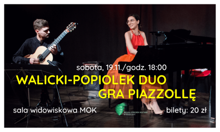 Astor Piazzolla to kompozytor, którego twórczość jest niezwykle eklektyczna. Twórczość Piazzolli grywają przeróżne składy, o rozmaitym brzmieniu, ale nigdy jeszcze muzyka ta nie została zaprezentowana przez duet gitarowo-fortepianowy. Walicki-Popiolek Duo tworzą aranżacje utworów tego argentyńskiego mistrza, wydając je w prestiżowym wydawnictwie nutowym Universal Editions. Artyści są stypendystami programu Młoda Polska realizowanego przez Narodowe Centrum Kultury i jedynym w Polsce klasycznym duetem gitarowo-fortepianowym. Podczas tego wieczoru usłyszą Państwo najsłynniejsze tanga Astora Piazzolli. Słynne „Libertango” zabrzmi razem z majestatycznym „Oblivion” z filmu „Henryk IV”, Lato z „Czterech pór roku” oszołomi wyrazistością i mozaiką motywów. Nie zabraknie również i utworów kompozytorów europejskich, których korzenie twórczości sięgają folkloru hiszpańskiego i portugalskiego połączonego z jazzem.