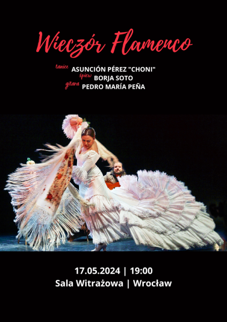 Na majowym Wieczorze Flamenco pokażemy prawdziwą andaluzyjską szkołę flamenco, albowiem do Wrocławia przyleci wyśmienita tancerka z Sewilli – Asunción Pérez pseud. „Choni”. Towarzyszyć jej będzie śpiewak flamenco Borja Soto, a na gitarze zagra pochodzący ze znanej muzycznej rodziny – Pedro María Peña. Mistrzowski, czysto hiszpański skład, zabierze nas w podróż do wyjątkowo pięknej i słonecznej Sewilli.