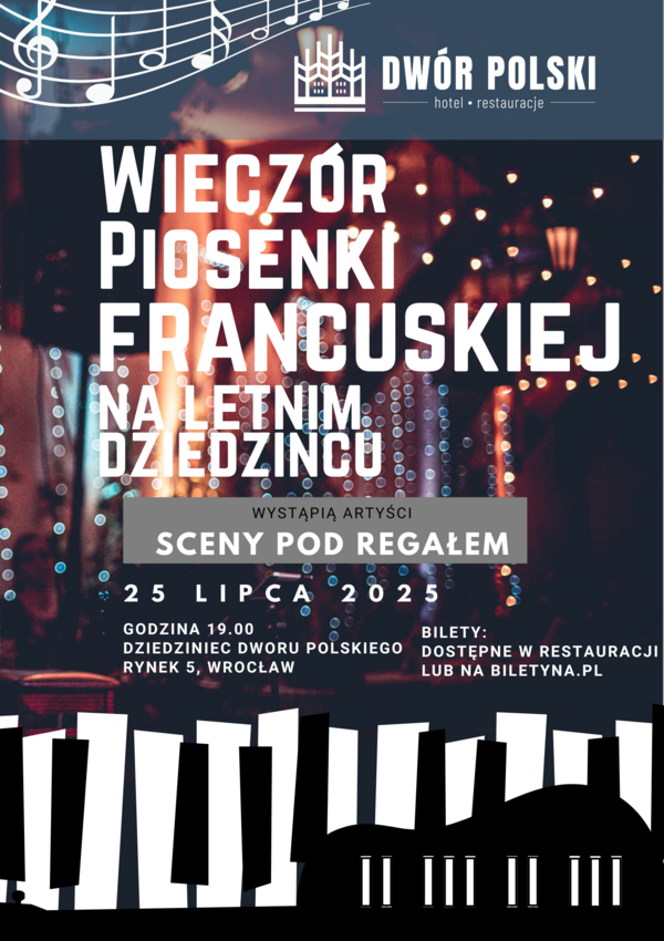 Już 25 dnia lipca zapraszamy letni dziedziniec Dworu Polskiego na godzinę 19:00, gdzie odbędzie się recital piosenki francuskiej w wykonaniu artystów Sceny pod Regałem na czele ze świetną wokalistką i aktorką scen polskich: PAULINĄ JEŻEWSKĄ!