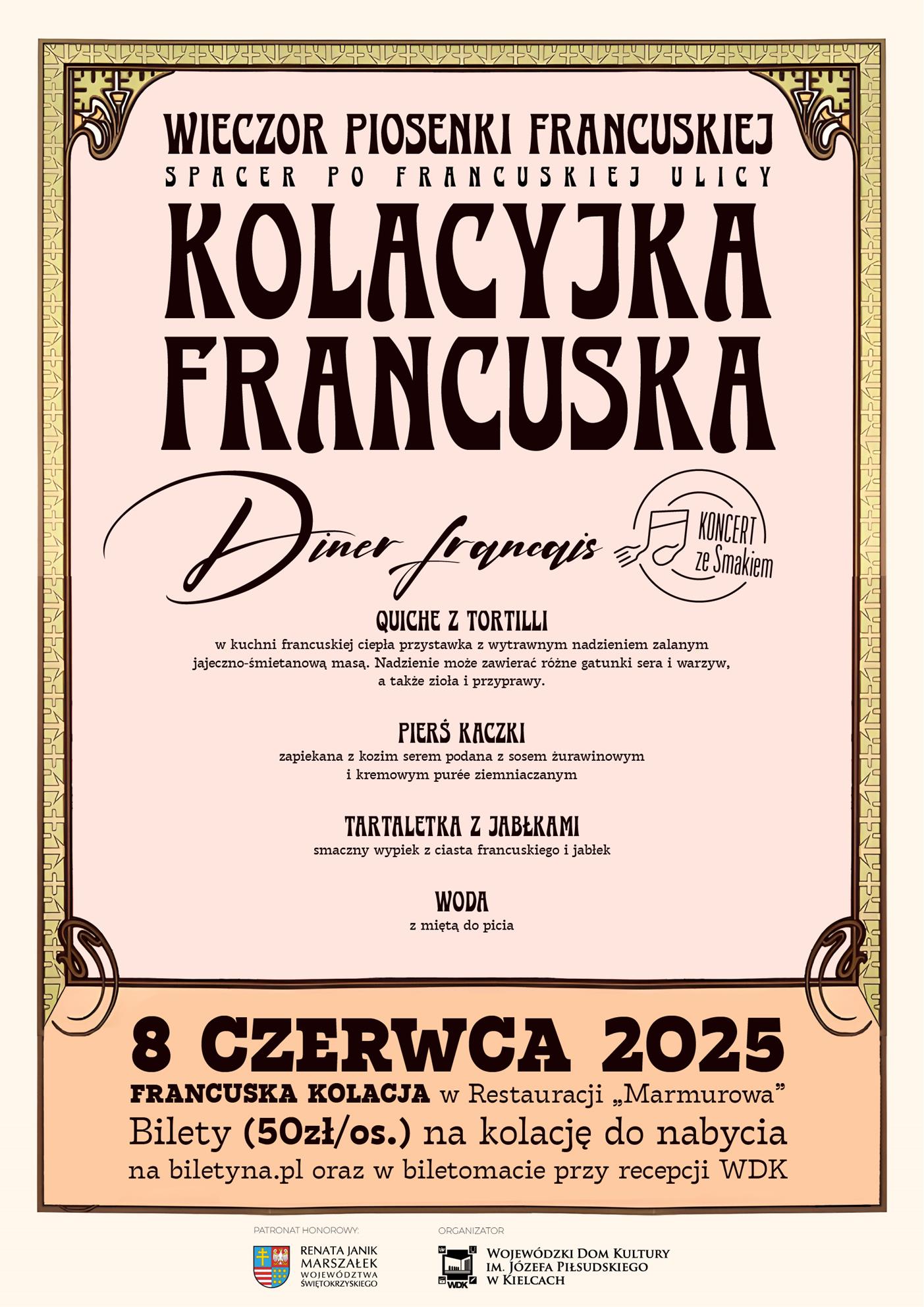 🍽 Francuska Kolacyjka – bilety (50 zł/os) dostępne na Biletyna.pl i w biletomacie przy recepcji WDK.