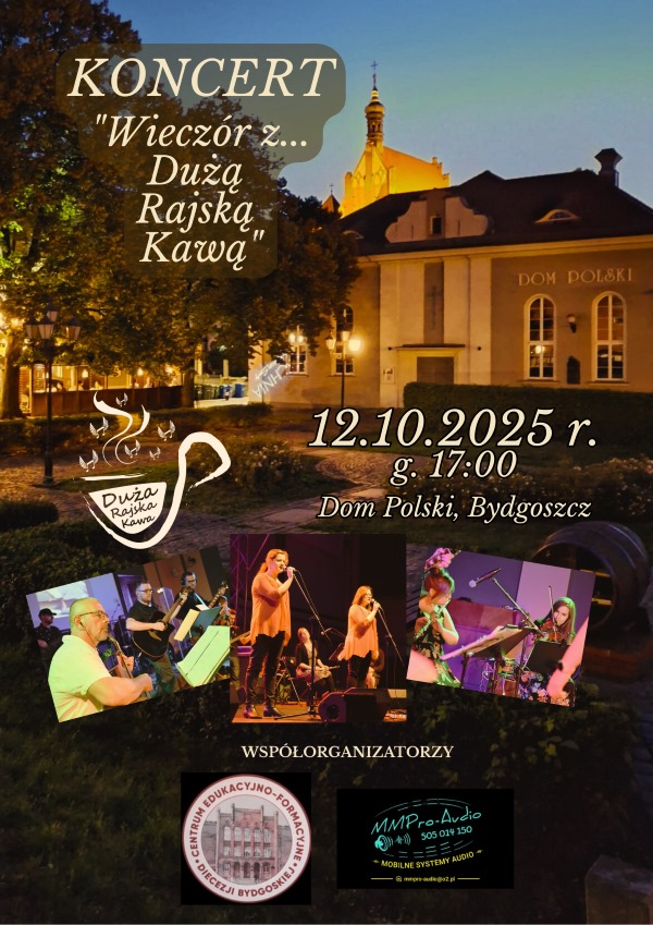 12 października 2025 o godzinie 17:00 w zabytkowych wnętrzach Domu Polskiego w Bydgoszczy odbędzie się niezwykły wieczór z zespołem Duża Rajska Kawa – połączenie muzyki, poezji i jesiennego klimatu.