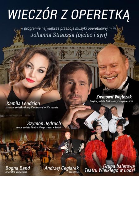 W programie największe przeboje operetkowe m.in. Johanna Straussa ( ojciec i syn), Kalmana, Lehara i wielu innych. Zapraszamy na piękny , ponad 2-godzinny koncert, podczas którego będziecie Państwo mogli przenieść się do zaczarowanej krainy operetki, ze znanymi , lubianymi ariami w wykonaniu znakomitych wokalistów z towarzyszeniem orkiestry kameralnej i nadającego klimatu balu wiedeńskiego – baletu Teatru Wielkiego w Łodzi. Ten piękny wieczór operetkowy będzie dla Państwa zwieńczeniem czasu karnawału.