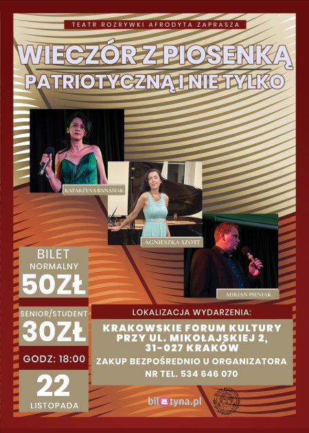Podczas koncertu Artyści Teatru Rozrywki AFRODYTA- Katarzyna Banasiak- wokalistka, aktorka scen muzycznych, Agnieszka Szott - wieloletni pedagog, sopranistka, trenerka wokalna, Adrian Pieniak- tenor, muzyk, aktor scen muzycznych, akordeonista wykonają utwory w klimacie patriotycznym z okresu walk narodowo- wyzwoleńczych w drodze do Odzyskania przez Polskę Niepodległości oraz utwory wykonywane przez współczesnych wykonawców.