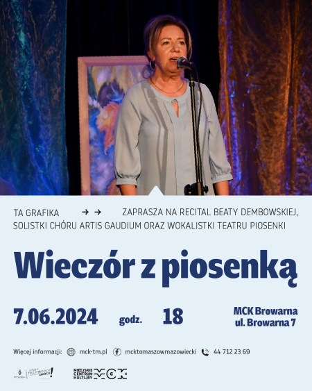 Beata Dembowska jest solistką chóru Artis Gaudium, a także wokalistką Teatru Piosenki – zajęć prowadzonych przez Katarzynę Goljat w MCK Browarna. Liczba miejsc ograniczona.
