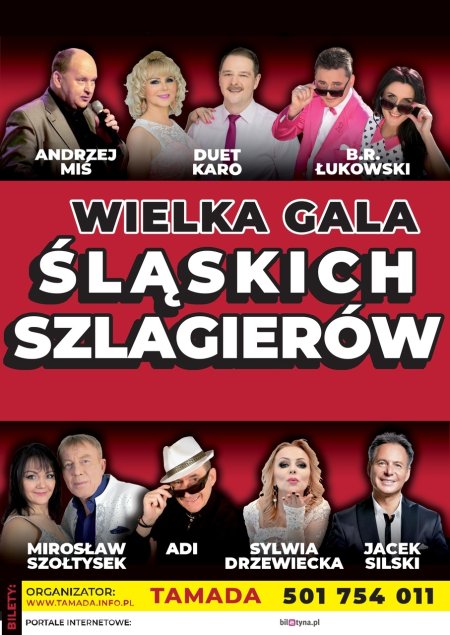 Gala Śląskich Szlagierów to znakomite niepowtarzalne muzyczne show i doskonała zabawa. Lekka, wesoła i prosta muzyka, jej przyjemne brzmienie, regionalny język, humor i ogromna dawka pozytywnej energii – to bez wątpienia wielki atut, który sprawia, że każdy koncert jest jedyny i niepowtarzalny.Pojawi się plejada najbardziej znanych i lubianych gwiazd znanych z rozgłośni radiowych i stacji telewizyjnych. Wystąpi: Sylwia Drzewiecka, Mirek Szołtysek, Adi, Jacek Silski ,Brygida i Robert Łukowscy ,Duet Karo .Duża dawka lubianych śląskich szlagierów i humor sprawi ,ze będzie to radosne, roztańczone i rozśpiewane , wspólnie spędzone 3 h.