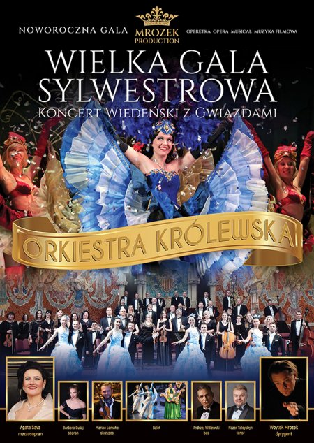 Montiego, utwory z repertuaru Roby Lakatosa. Całość koncertu poprowadzi znany światowej publiczności dyrygent i wirtuoz klarnetu Maestro Woytek Mrozek, który aktywnie koncertuje na całym świecie. "..Mrozek należy do grona poszukiwanych na świecie artystów..." napisała Süddeutsche Zeitung w Monachium. Artysta słynie z niekonwencjonalnych pomysłów i nieposkromionej wyobraźni. Artyści przeniosą słuchaczy do ojczyzny walca prezentując niezwykły kunszt wokalny i instrumentalny. Ta niezwykła gala będzie wzbogacona wirtuozerskim tańcem par tanecznych, barwnymi kreacjami i bogatą choreografią, co pozwoli na doświadczenie wielu doznań artystycznych w iście książęcym stylu. Pary taneczne to soliści Narodowego Teatru Opery i Baletu we Lwowie. W ten magiczny wieczór zabrzmią największe przeboje Króla walca Johanna Straussa takie jak uwertura z Zemsty Nietoperza, Keiser Marsz, Marsz Radezki, walc „Nad pięknym modrym Dunajem”, „Odgłosy wiosny” a także polki Trich Trasch, Eljen Magiar Polka, Anne Polka, Gromy i Błyskawice i wiele innych orkiestrowych szlagierów. Nie zabraknie także popisowych arii i duetów z najsłynniejszych operetek: Zemsty Nietoperza, Barona Cygańskiego, Księżniczki Czardasza, Hrabiny Maricy, Wesołej Wdówki czy Krainy Uśmiechu. Publiczność wysłucha między innymi: arie „Adeli”, „Czardasz Sylvi”, kuplety Barinkaya „Wielka sława to żart”, „Graj Cyganie”, „ Artystki z Variete”, „Brunetki Blondynki” a także duety wszechczasów, m.in. „Usta milczą dusza śpiewa”, „Jakże mam Ci wytłumaczyć”, „ Jedź do Verasdin”, „ Co się dzieje oszaleję”, „W rytm walczyka”, „Tłumy Franków” z Księżniczki Czardasza. Nie zabraknie także sztandarowych pieśni neapolitańskich takich jak: „Funikuli-Funikula”, „O Surdato N’namurato”. W drugiej części koncertu artyści zaprezentują się w repertuarze musicalowym, filmowym i światowych przebojów m.in.: „Za Tobą pójdę jak na bal” – K. Krawczyka, „Wielka Miłość” – S. Krajewskiego, „Delilah” – T. Jonsa, „Nella Fantasia” z filmu Misja, „New York-New York” – F. Sinatry, „Volare”, „O sole mio” – w wersji E. Presleya, „Przetańczyć całą noc” z musicalu My Fair Lady, „Gdybym był bogaczem” z musicalu Skrzypek na dachu i wiele innych noworocznych, muzycznych niespodzianek.