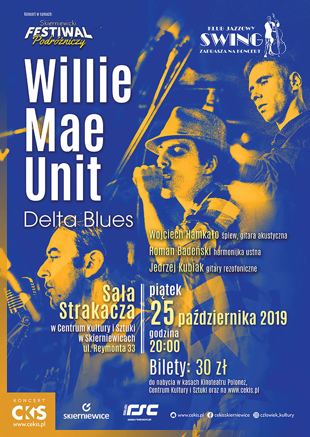 Tradycją staje się już, że Klub jazzowy SWING łączy siły z innymi stałymi formami działalności Centrum Kultury i Sztuki w Skierniewicach. Tym razem, w ramach kolejnego Skierniewickiego Festiwalu Podróżniczego (22-26 października 2019 r.), zapraszamy na wyjątkową muzyczną podróż do Delty Missisipi, w którą zabiorą nas muzycy akustycznego, bluesowego trio Willie Mae Unit.