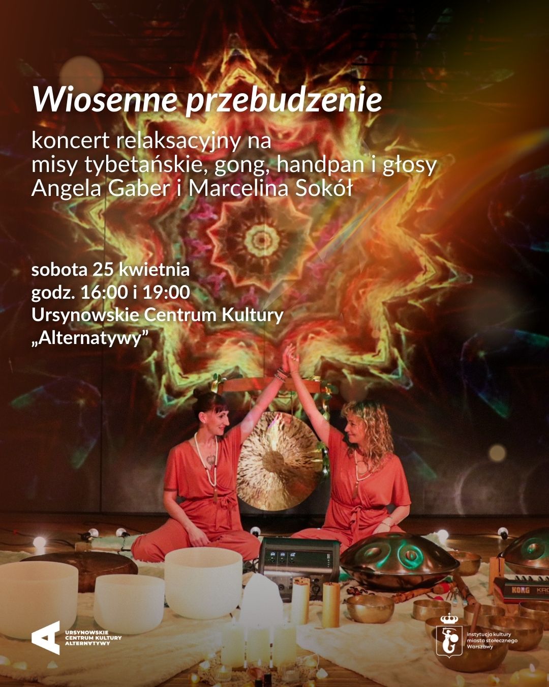 Pełen relaks w dźwiękach mis kryształowych, tybetańskich, gongu, handpanu, głosu oraz innych instrumentów z różnych stron świata. Podczas spotkania usłyszymy nie tylko piękne brzmienia, ale doświadczymy głębokiego relaksu i odprężenia. Koncerty relaksacyjne to terapeutyczne podróże muzyczne, które są nie tylko wrażeniem estetycznym, ale też sposobem na błyskawiczne przywrócenie harmonii duszy i ciała. Wydarzenie poprowadzi kobiecy duet Angela Gaber i Marcelina Sokół (Merkaba Music Theraphy).
