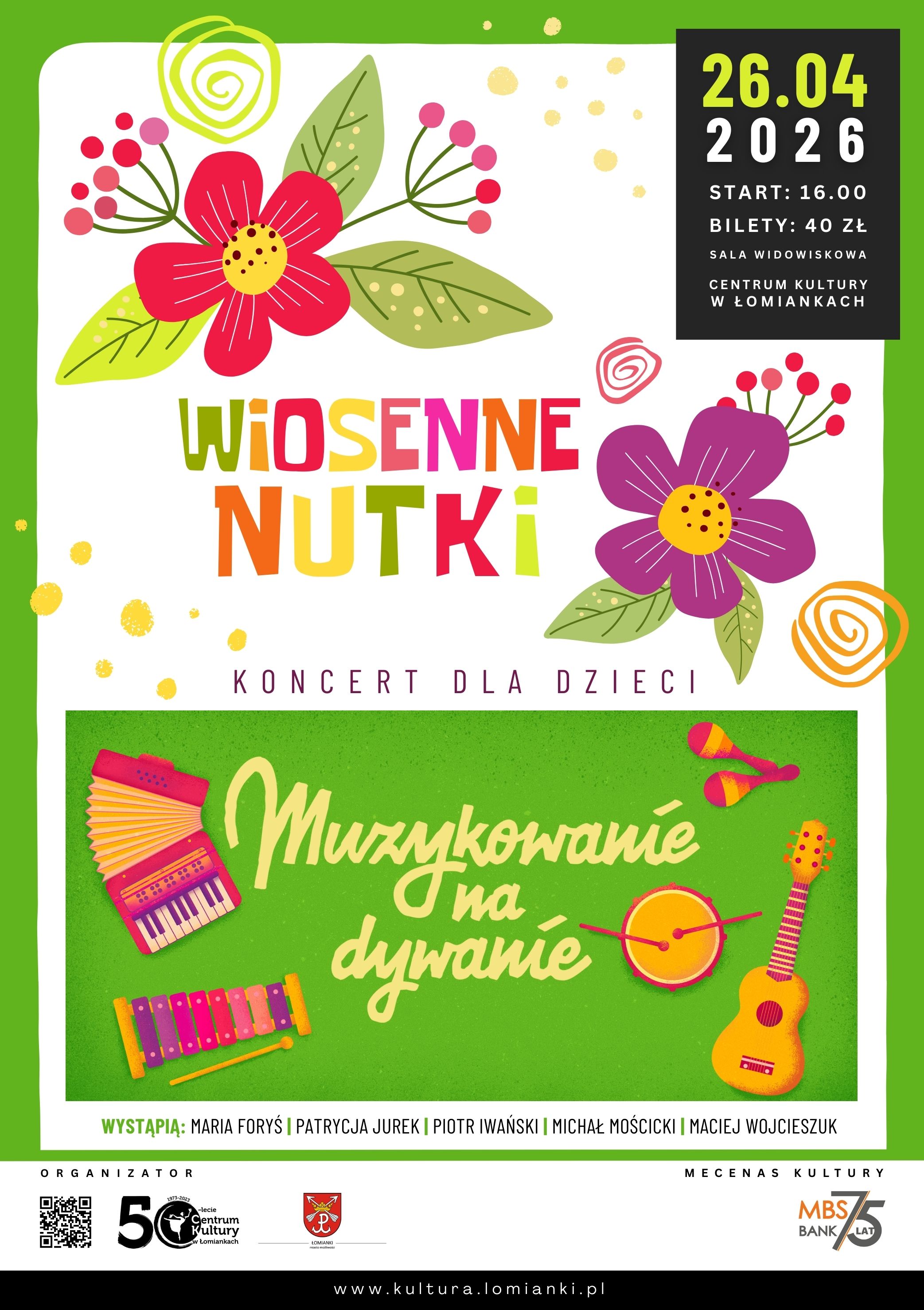 „Wiosenne nutki” to koncert muzyczno - taneczny dla najmłodszych. Każdy projekt „Muzykowanie na dywanie” jest wyjątkową i niepowtarzalną muzyczną przygodą mającą swój dominujący motyw tematyczny, który inspiruje do kreatywnych zabaw i animacji przy muzyce granej na żywo.