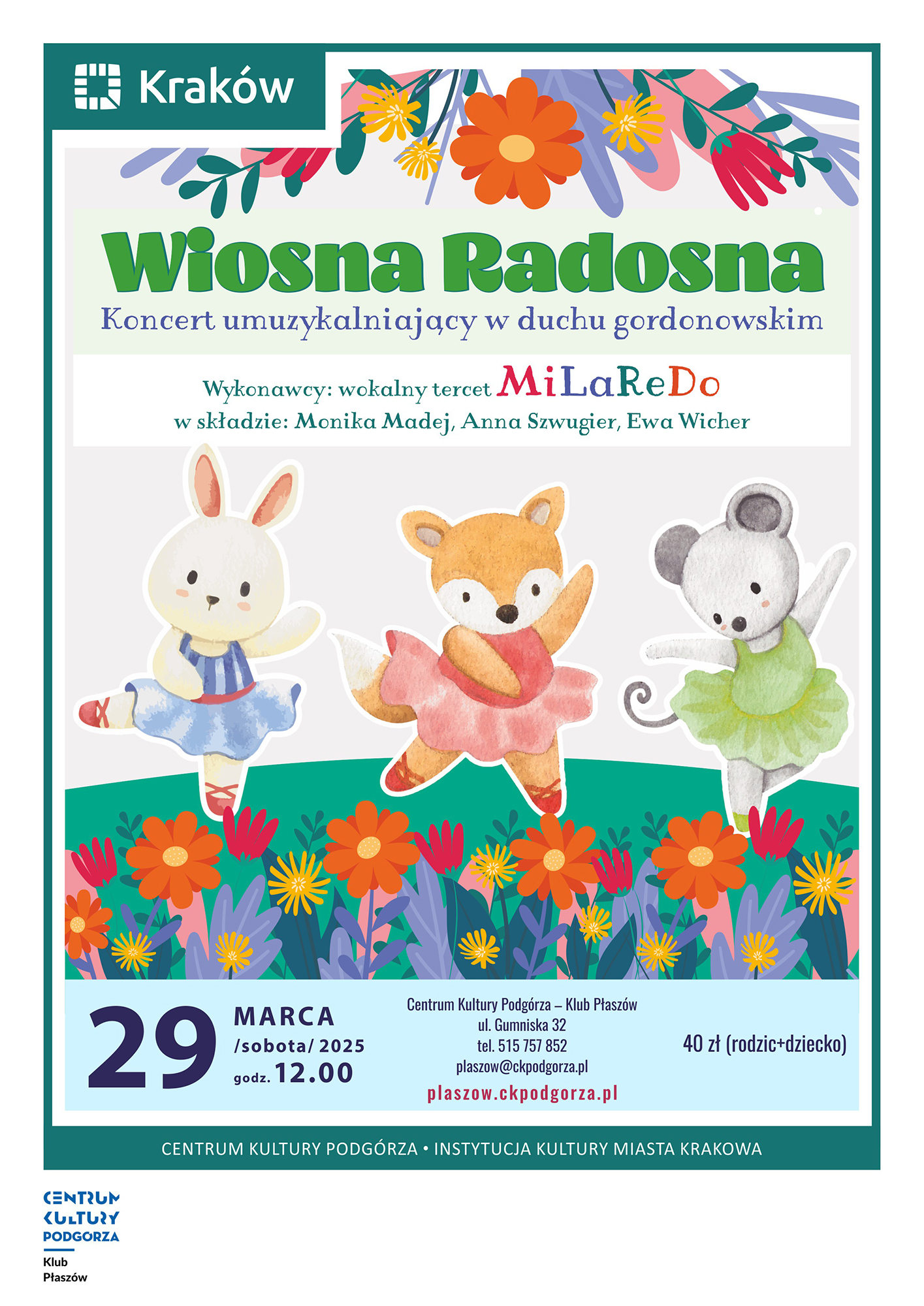 Wiosna to najpiękniejsza pora roku, robi się coraz cieplej, wszystko budzi się z zimowego snu, rośliny zakwitają, drzewa i krzewy wypuszczają zielone pędy i liście, zwierzęta aktywizują się. Zatem świętujmy nadejście wiosny poprzez muzykę: ćwierkające ptaszki, bzyczące pszczółki, szeleszczące w liściach jeże, a także kumkające żaby i klekoczące bociany będą towarzyszyć nam wszystkim podczas tego radosnego muzycznego wydarzenia. Zachęcamy do przyniesienia ulubionej maskotki zwierzaka, który kojarzy się z wiosną. Obowiązkowe skarpety antypoślizgowe lub obuwie na zmianę.